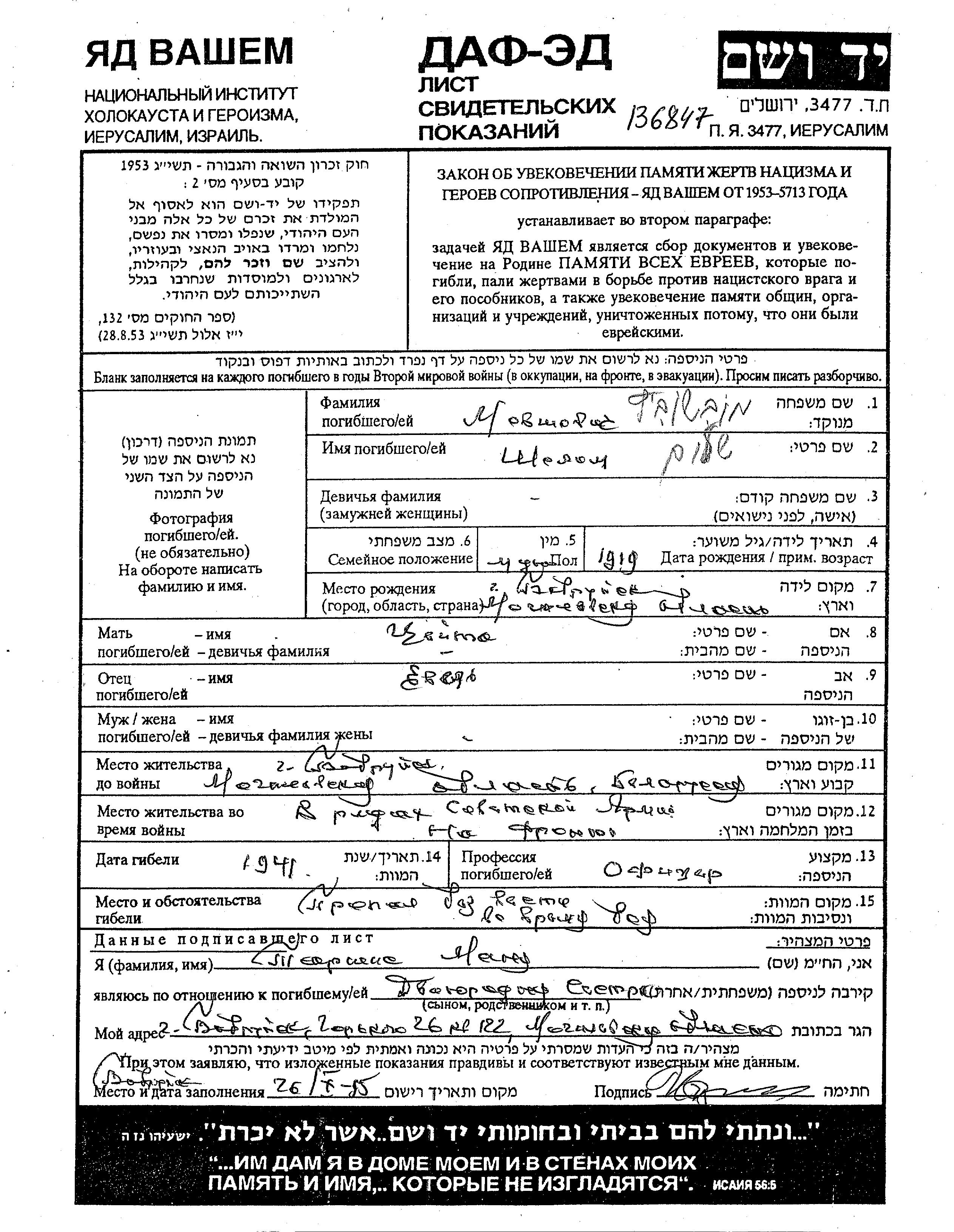 Shelom Movshovich wurde im Jahr 1919 in Bobruysk, Weißrussland (UdSSR) geboren. Er war Offizier. Vor dem Zweiten Weltkrieg lebte er in Bobruysk, Weißrussland (UdSSR).