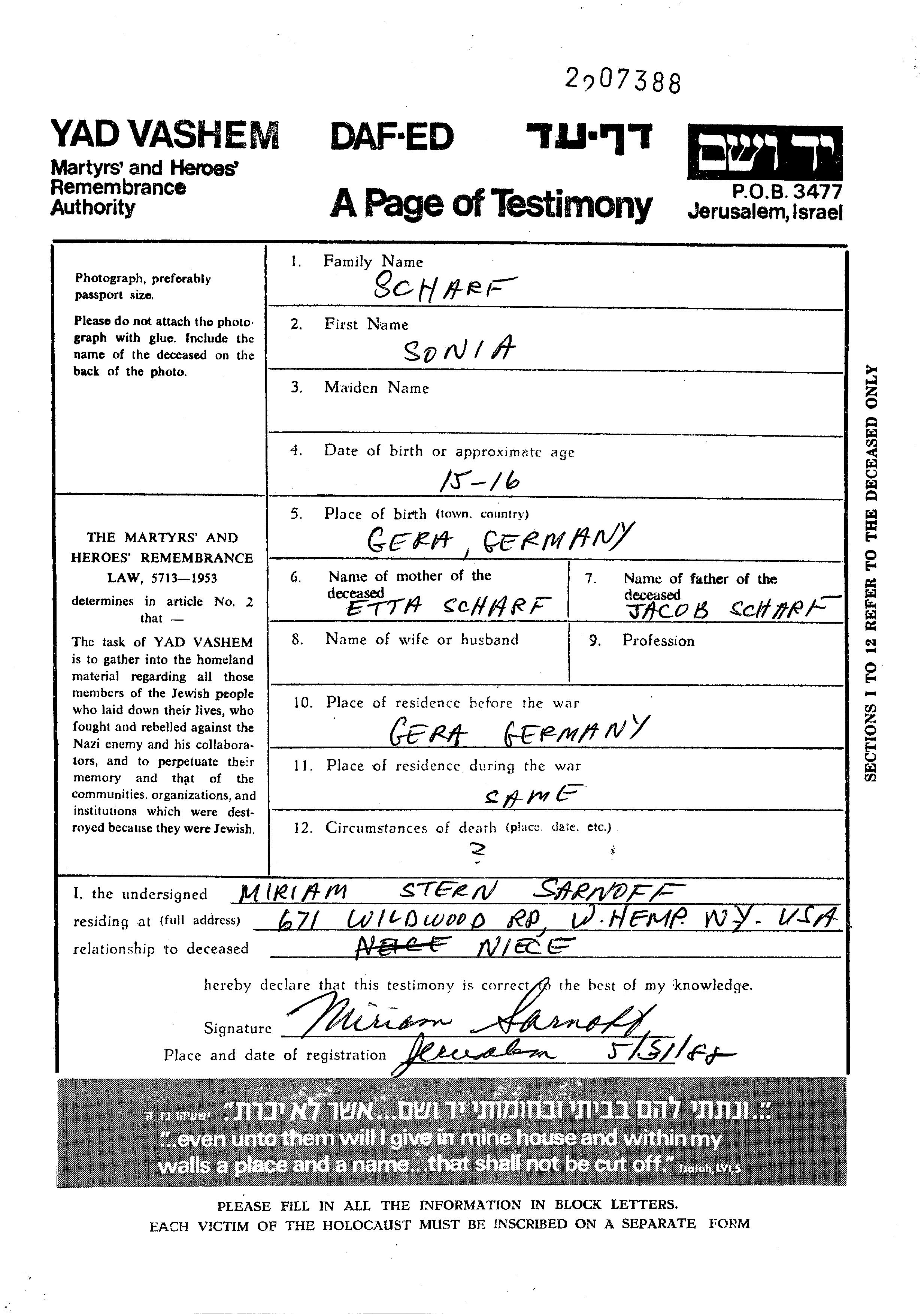 Sonia wurde in der Schoah ermordet. Todesort: unbekannter Ort.