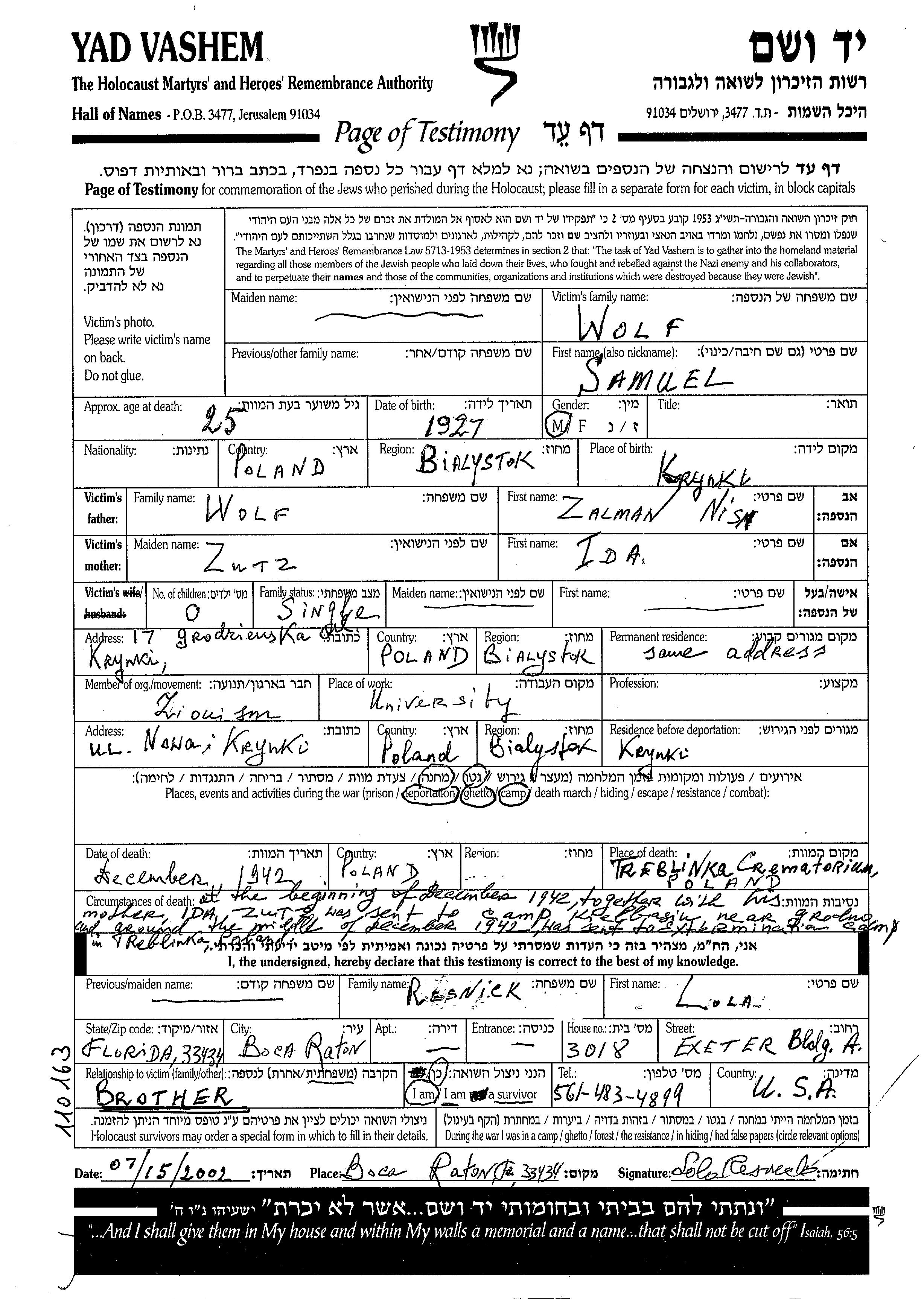 Samuel Wolf wurde im Jahr 1917 in Krynki, Polen geboren. Vor dem Zweiten Weltkrieg lebte er in Krynki, Polen.