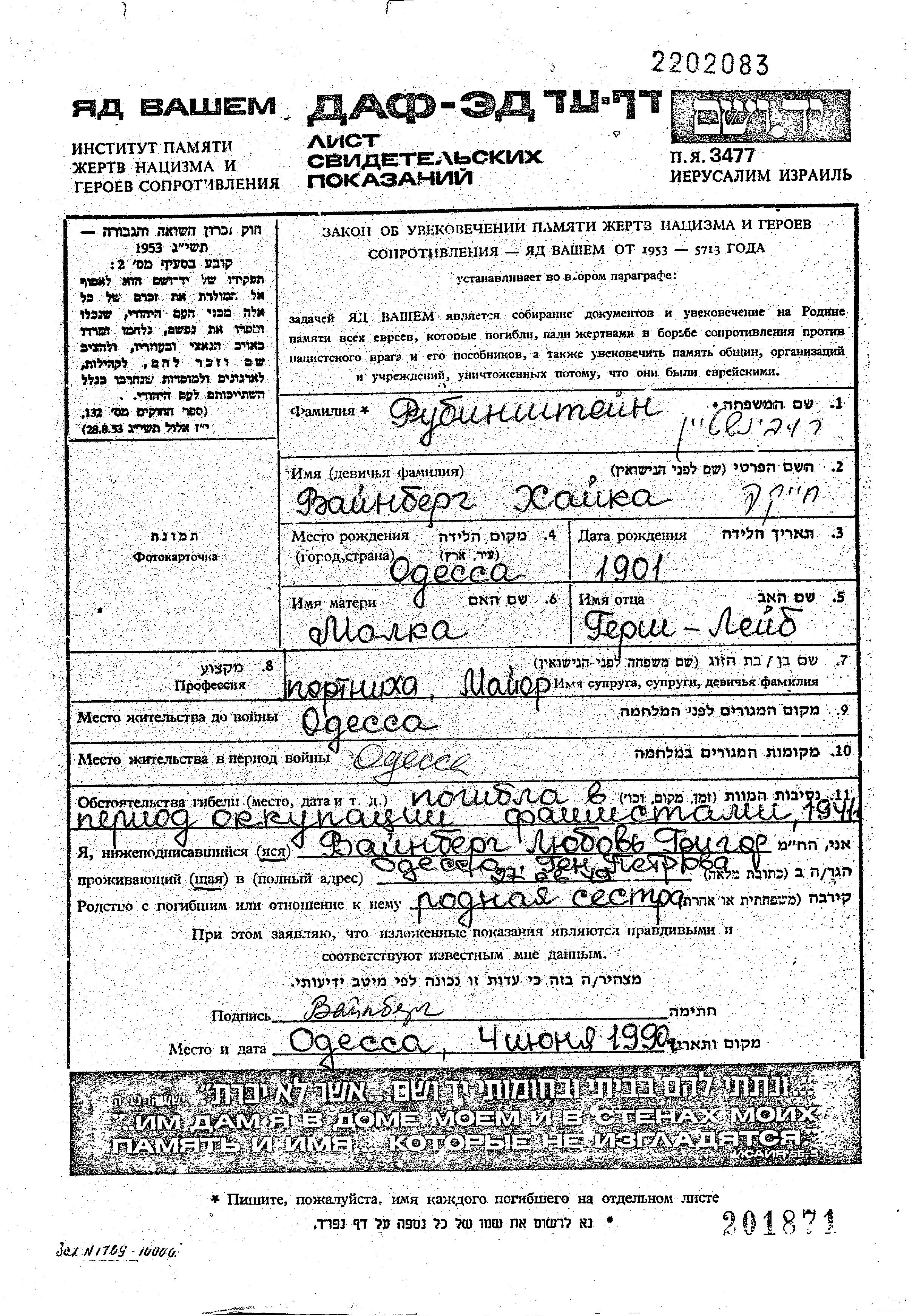 Khaya Rubinshtein, geb. Vainberg wurde im Jahr 1901 in Odessa, Ukraine (UdSSR) geboren. Vor dem Zweiten Weltkrieg lebte sie in Odessa, Ukraine (UdSSR).