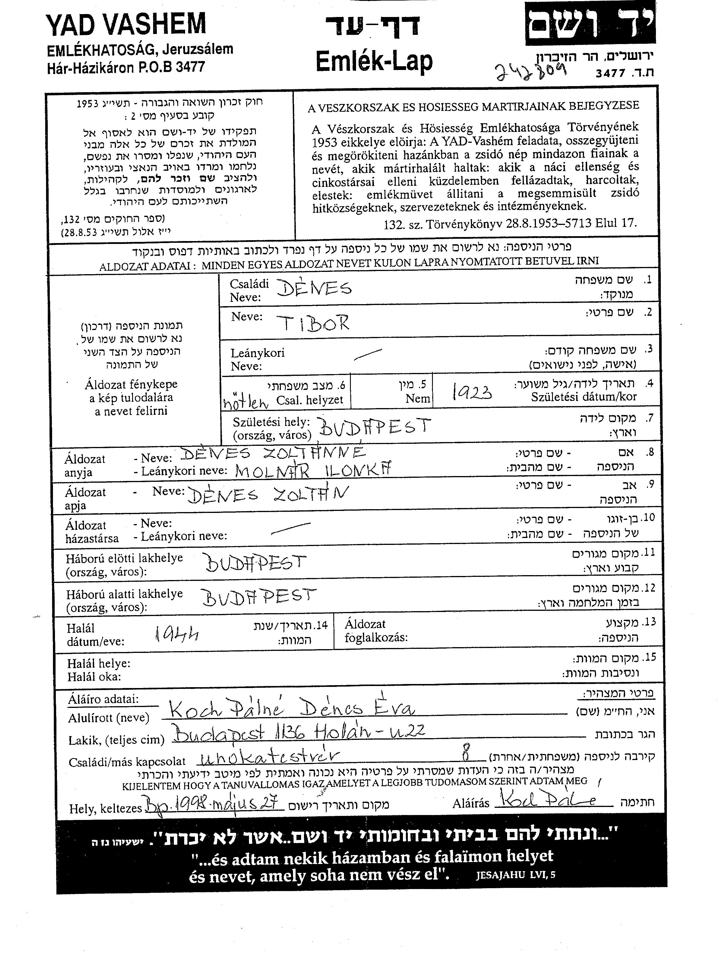 Tibor wurde in der Schoah ermordet. Todesort: unbekannter Ort im Jahr 1944.
