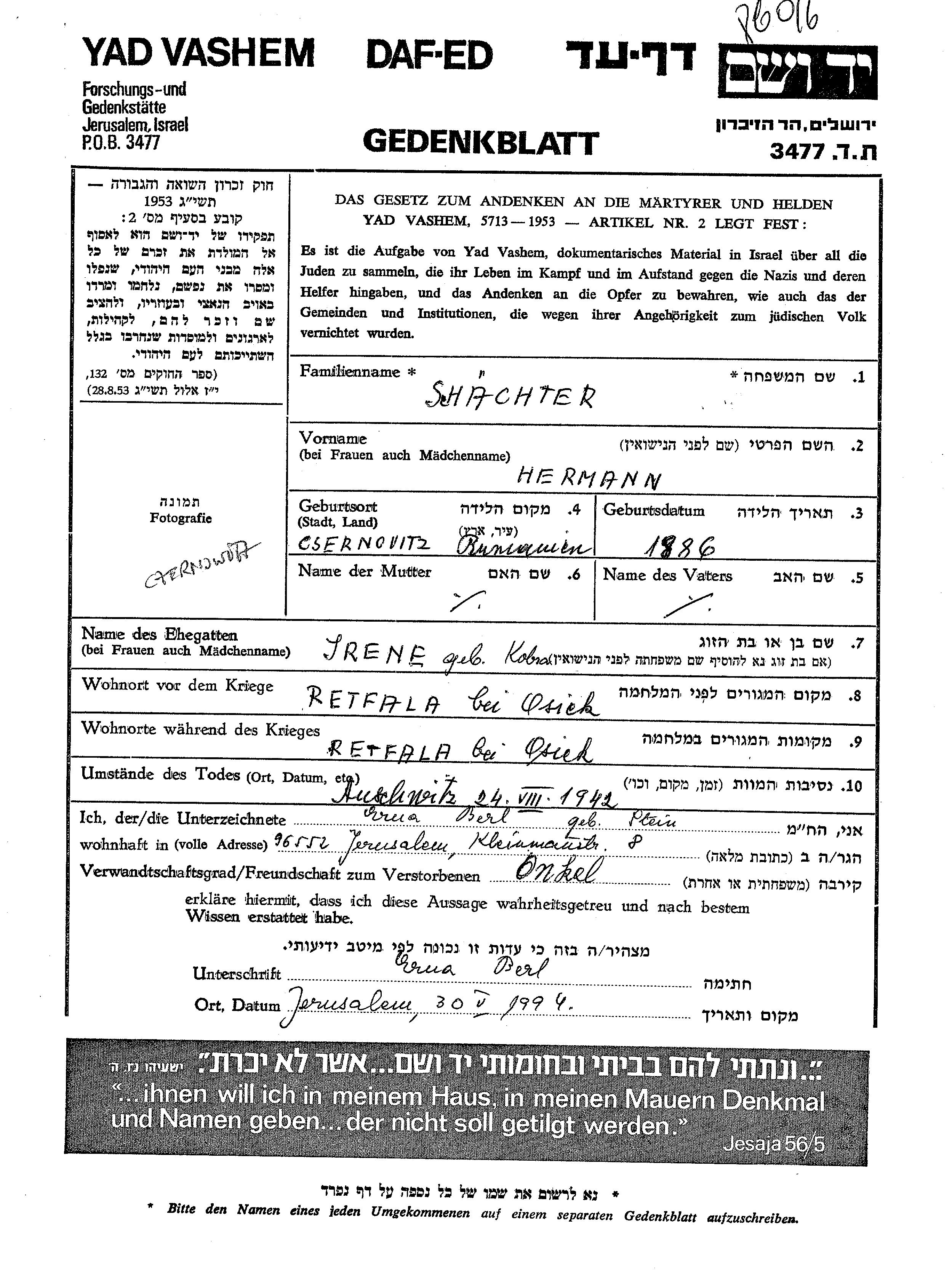 | Schächter | Hermann | Retfala, Jugoslawien | Gedenkblatt |