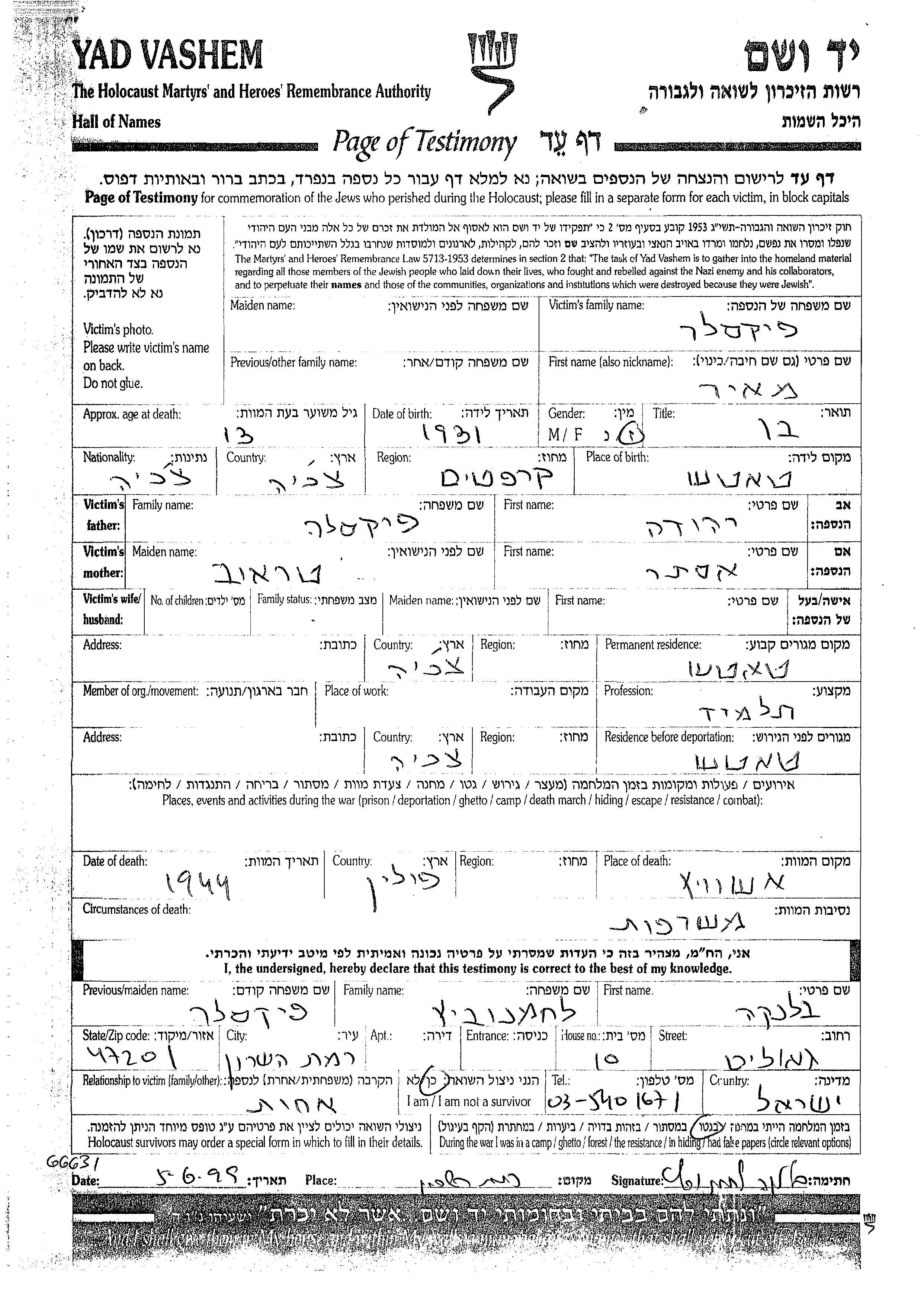 Fiksler | Meir | 1931 | Tetsh, Tschechoslowakei | Gedenkblatt |