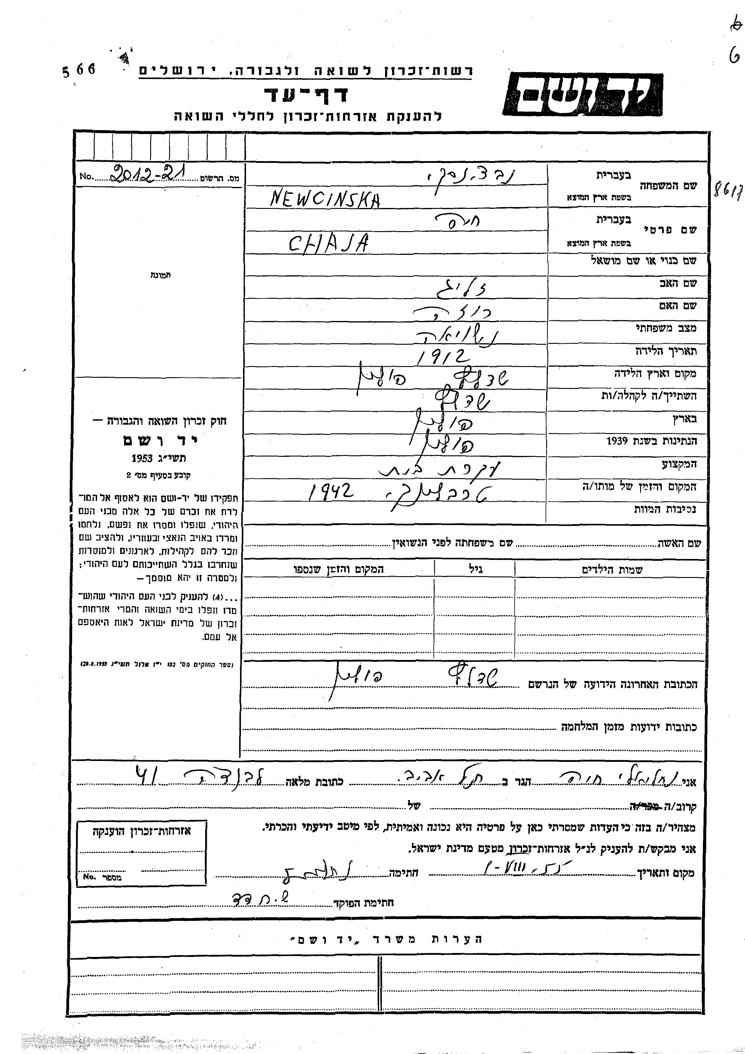 Chaja Newcinska wurde im Jahr 1912 in Siedlce, Polen geboren. Sie war die Tochter von Zelig und Roza. Sie war Hausfrau und Verheiratet. Vor dem Zweiten Weltkrieg lebte sie in Siedlce, Polen. Während des Krieges war sie in Siedlce, Polen.