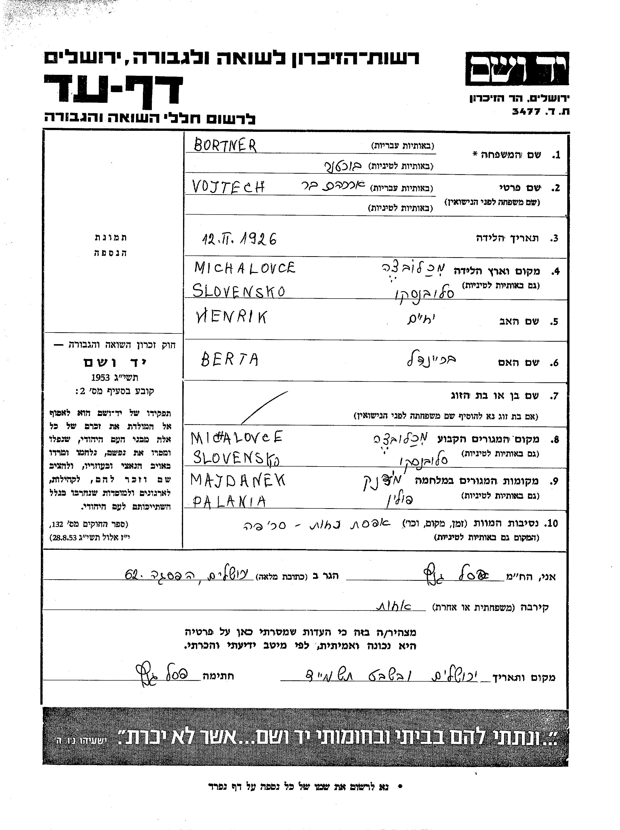 Bortner Vojtech Avraham Ber 1926 Michalovce, Tschechoslowakei Gedenkblatt