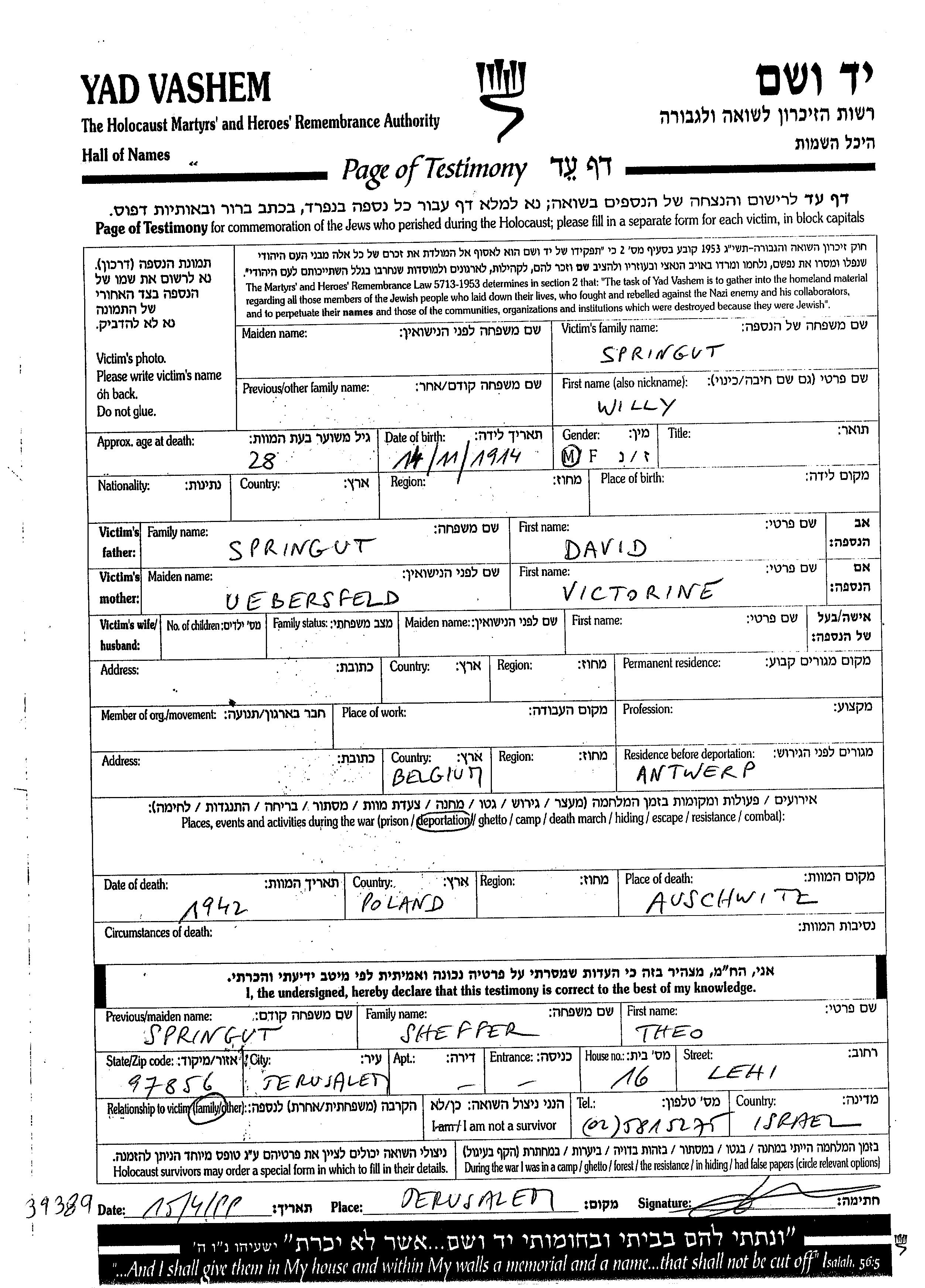 Willy Springut wurde im Jahr 1914 in S Gravenhage, Niederlande geboren. Er war Angestellte/-r. Vor dem Zweiten Weltkrieg lebte er in Antwerpen, Belgien.