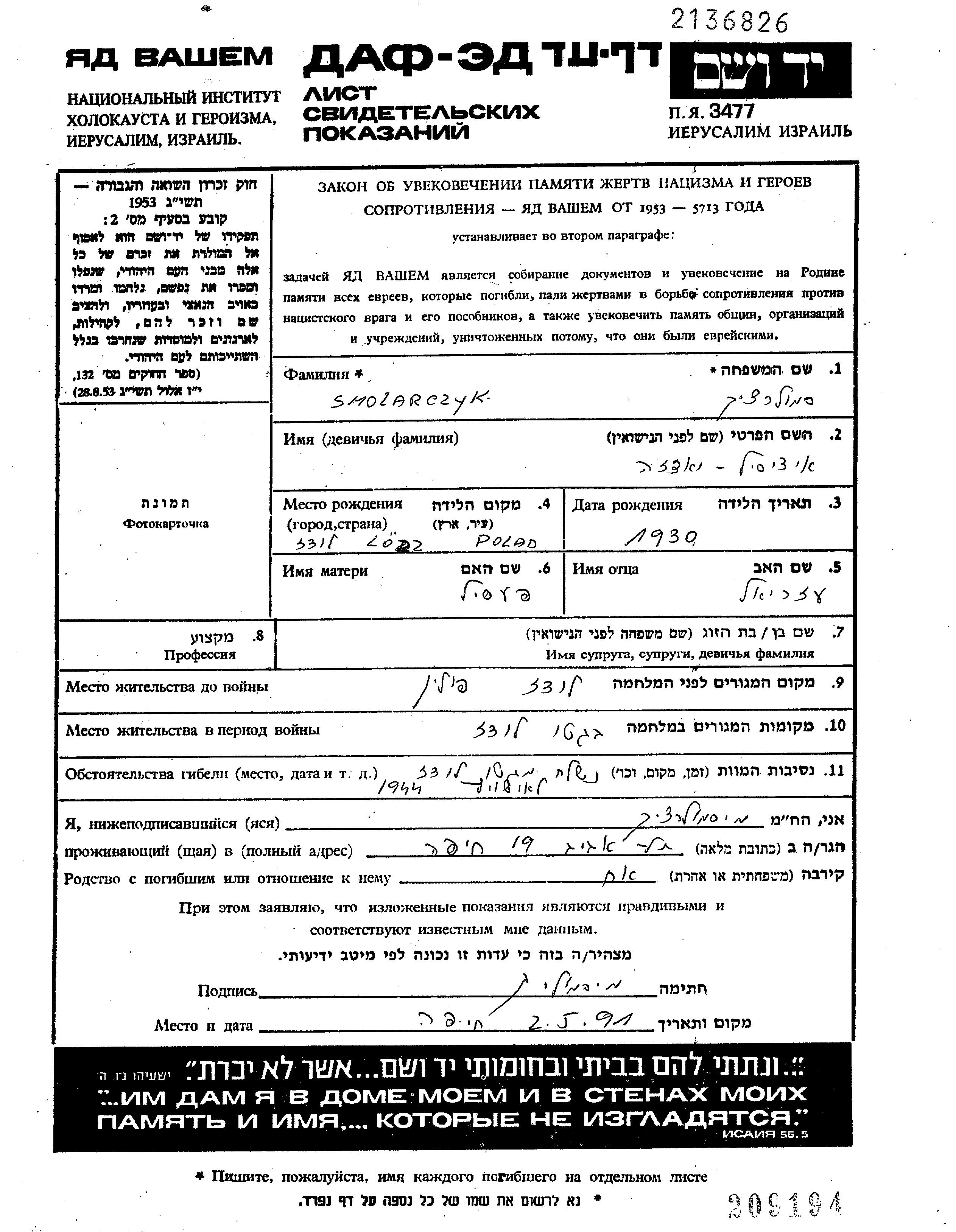 Smolarczyk Idisel Yadviga Lodz, Polen Gedenkblatt