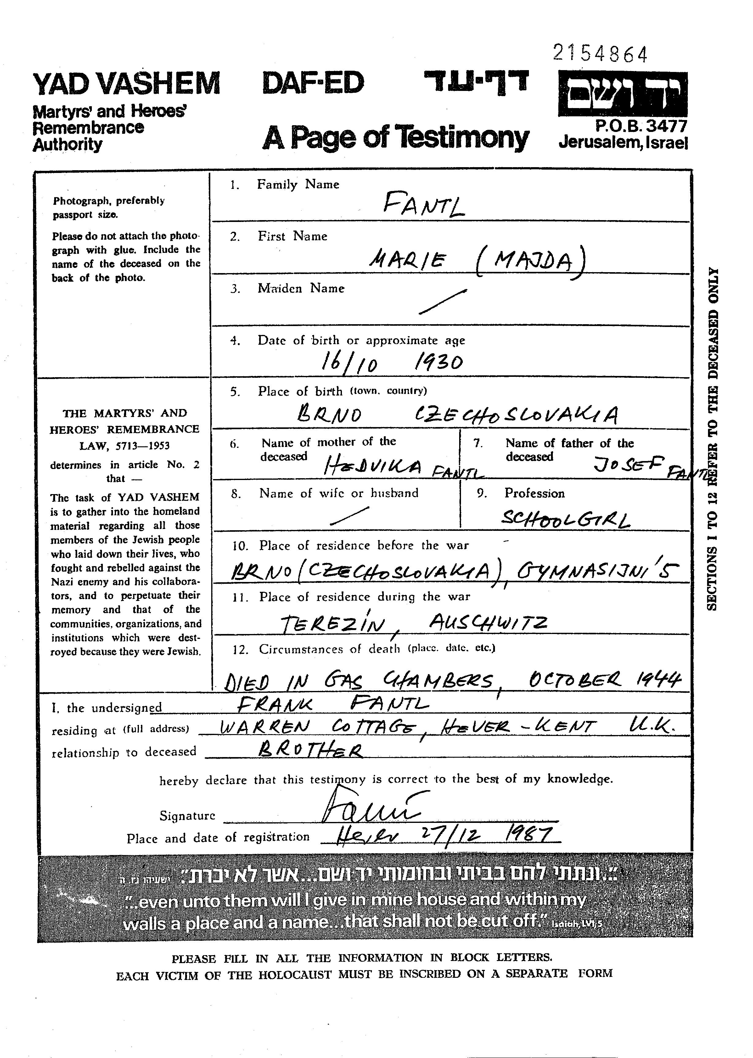 Marie Majda Fantlova Pentel wurde im Jahr 1930 in Brno, Tschechoslowakei geboren. Sie war Schüler/-in. Vor dem Zweiten Weltkrieg lebte sie in Brno, Tschechoslowakei.