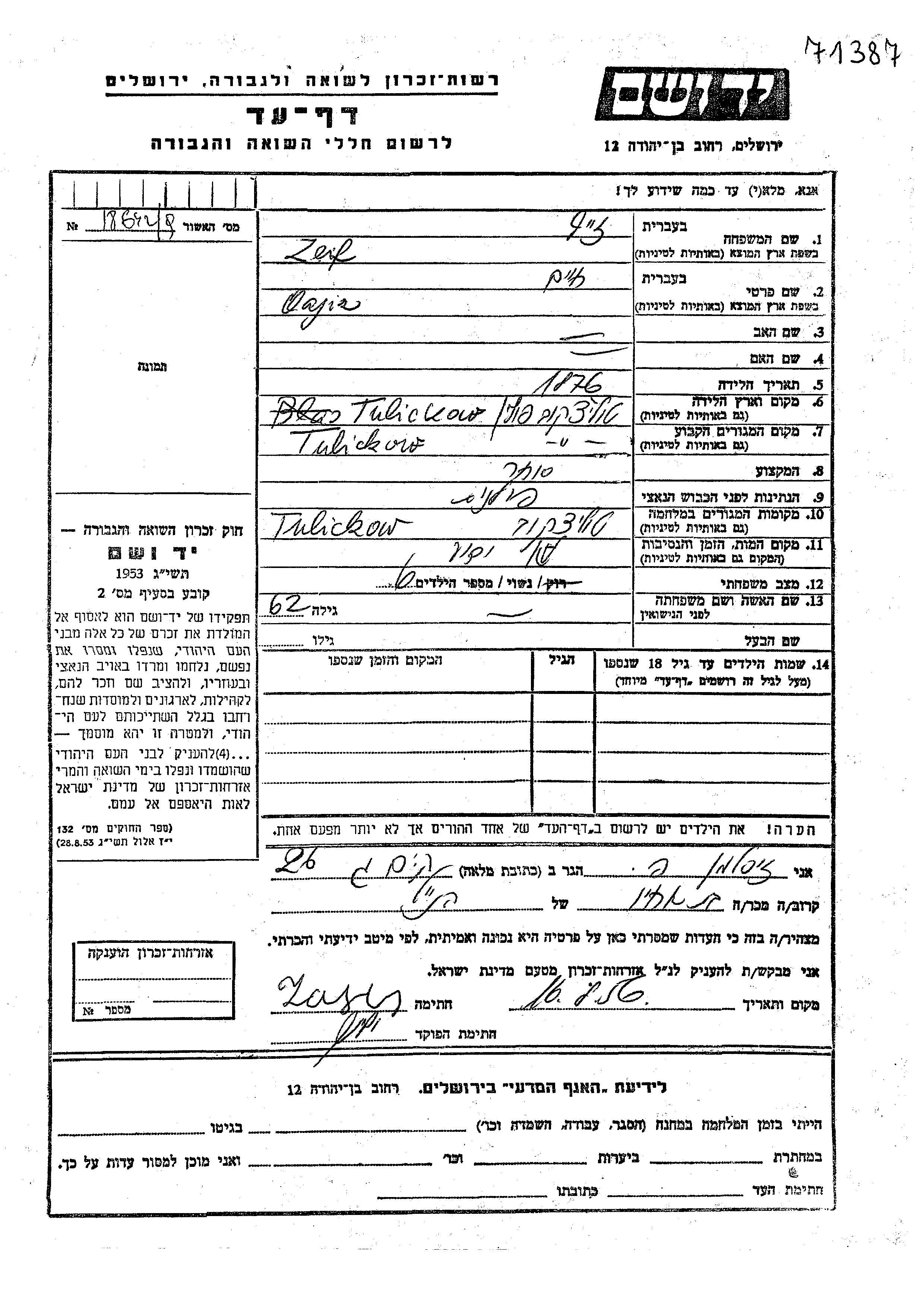 Oajiz Khaim Zeif wurde im Jahr 1876 in Tuliszkow, Polen geboren. Er war Kaufmann/-frau und Verheiratet. Vor dem Zweiten Weltkrieg lebte er in Tuliszkow, Polen. Während des Krieges war er in Tuliszkow, Polen.