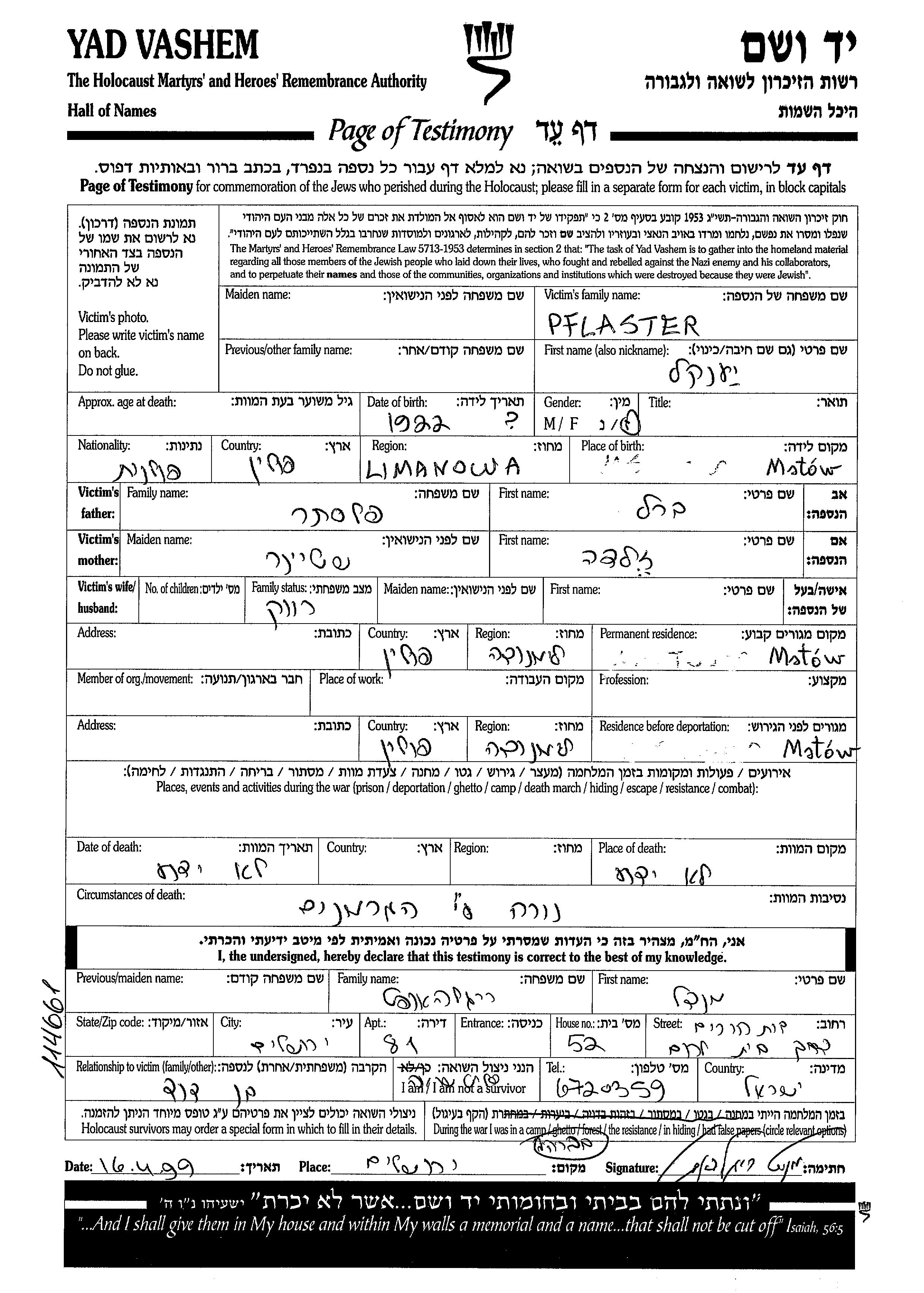 Yankel Pflaster wurde im Jahr 1922 in Mstow, Polen geboren. Vor dem Zweiten Weltkrieg lebte er in Mstow, Polen.