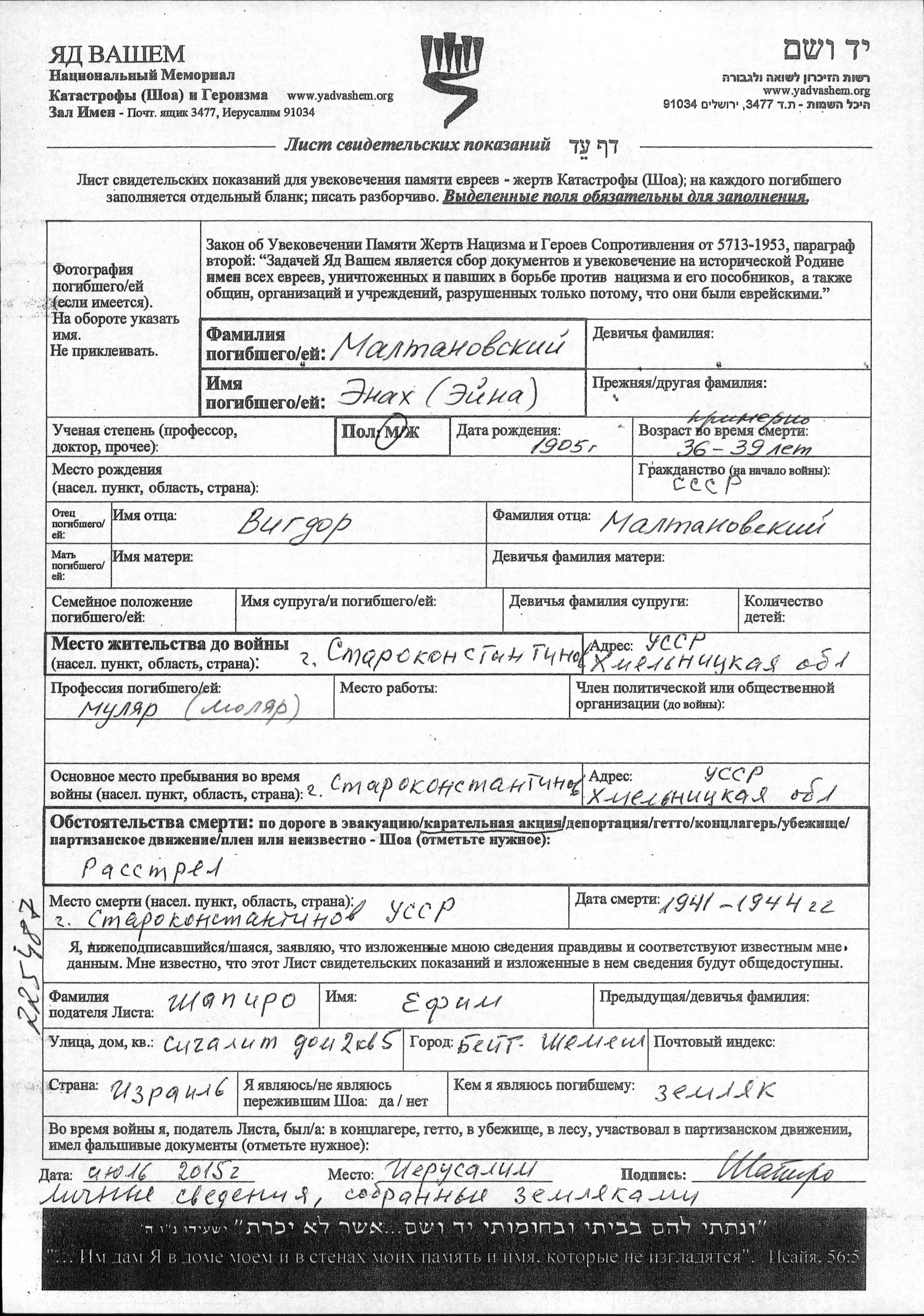 Enakh Eyna Maltanovskiy wurde im Jahr 1905 geboren. Vor dem Zweiten Weltkrieg lebte er in Starokonstantinov, Ukraine (UdSSR).