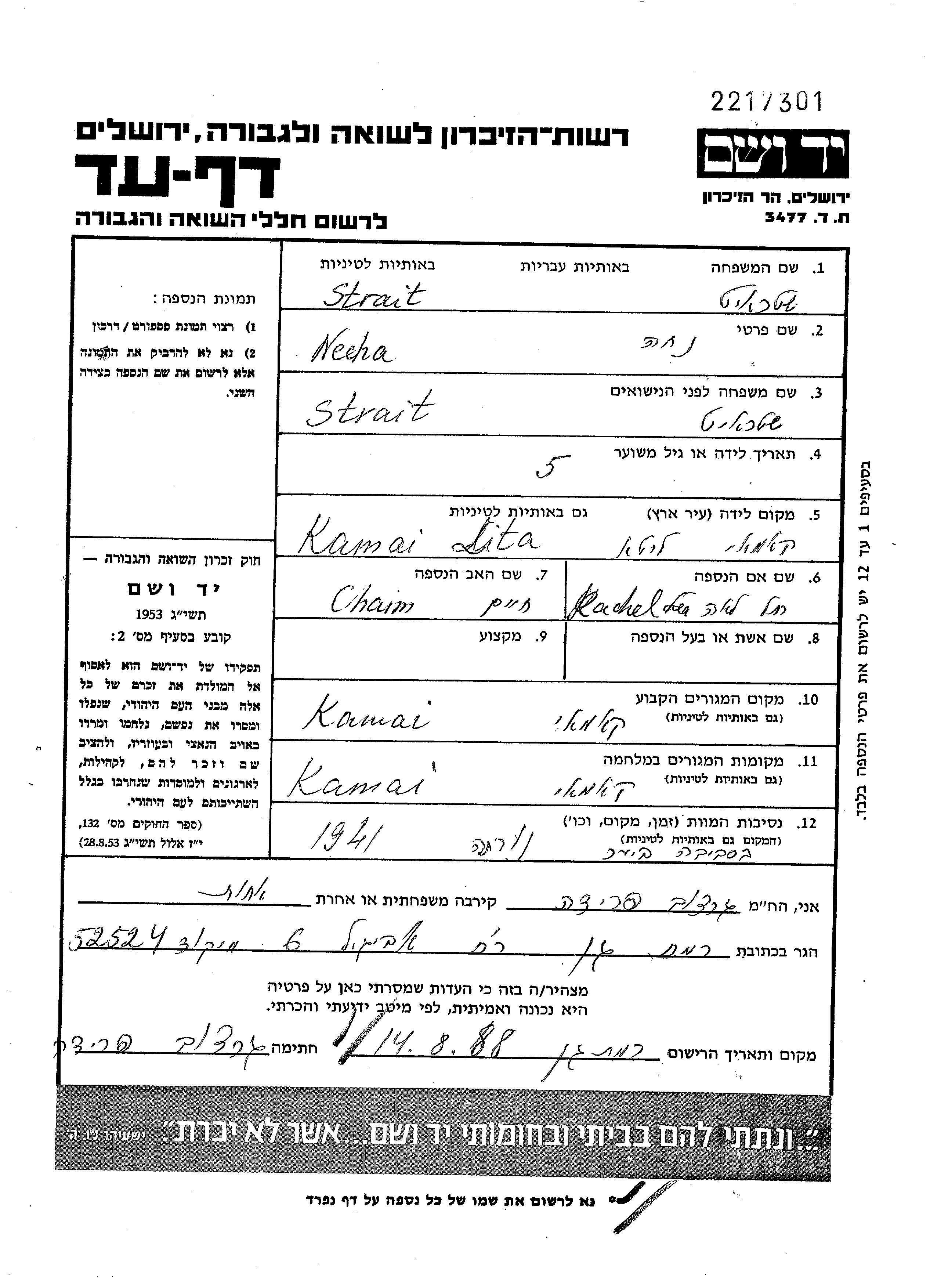 Necha Strait wurde in Kamajai, Litauen geboren. Vor dem Zweiten Weltkrieg lebte sie in Kamajai, Litauen.