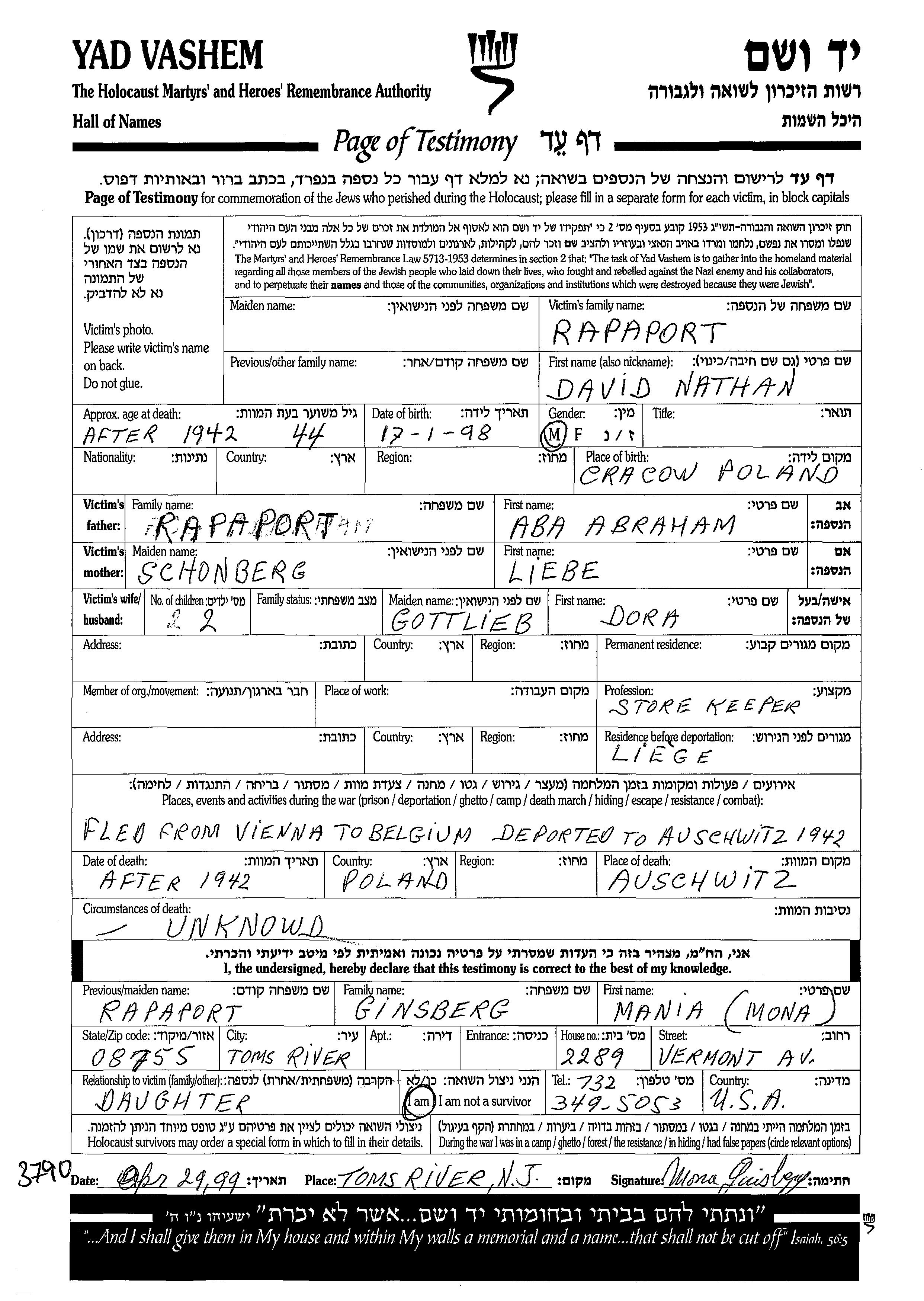 Rapaport David Nathan 1898 Krakau, Polen Liste von Deportierten