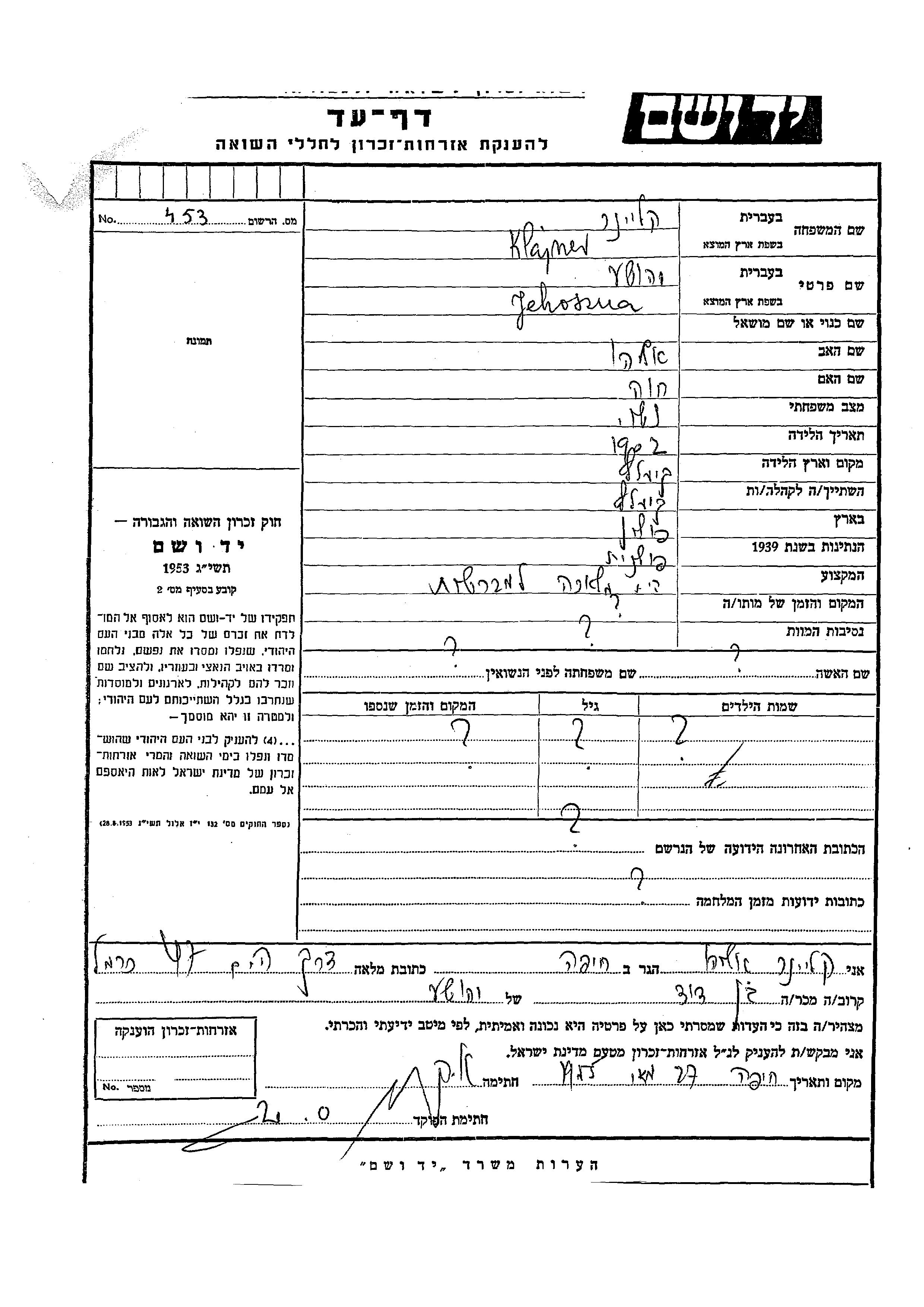 Klajner Yehoshua 1902 Kielce, Polen Gedenkblatt