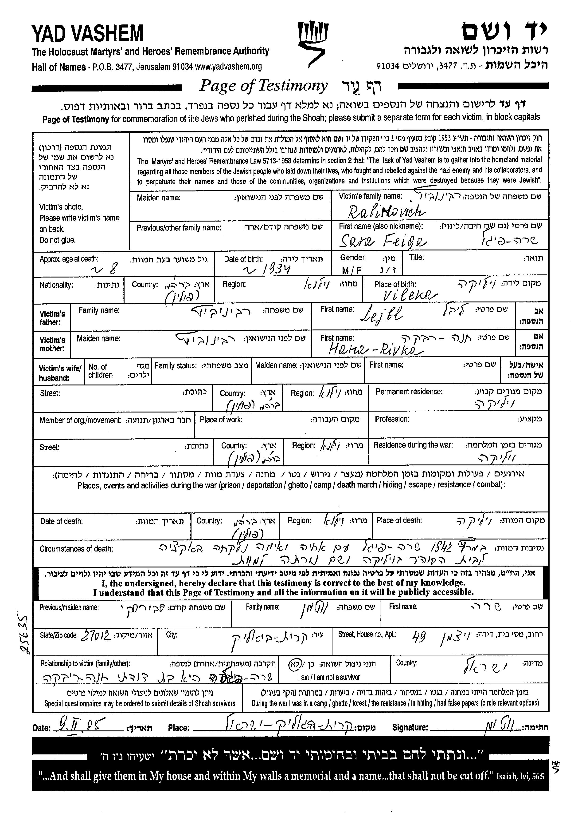 Feigl Sara Rabinovitz wurde im Jahr 1934 in Wilejka, Polen geboren. Vor dem Zweiten Weltkrieg lebte sie in Wilejka, Polen.