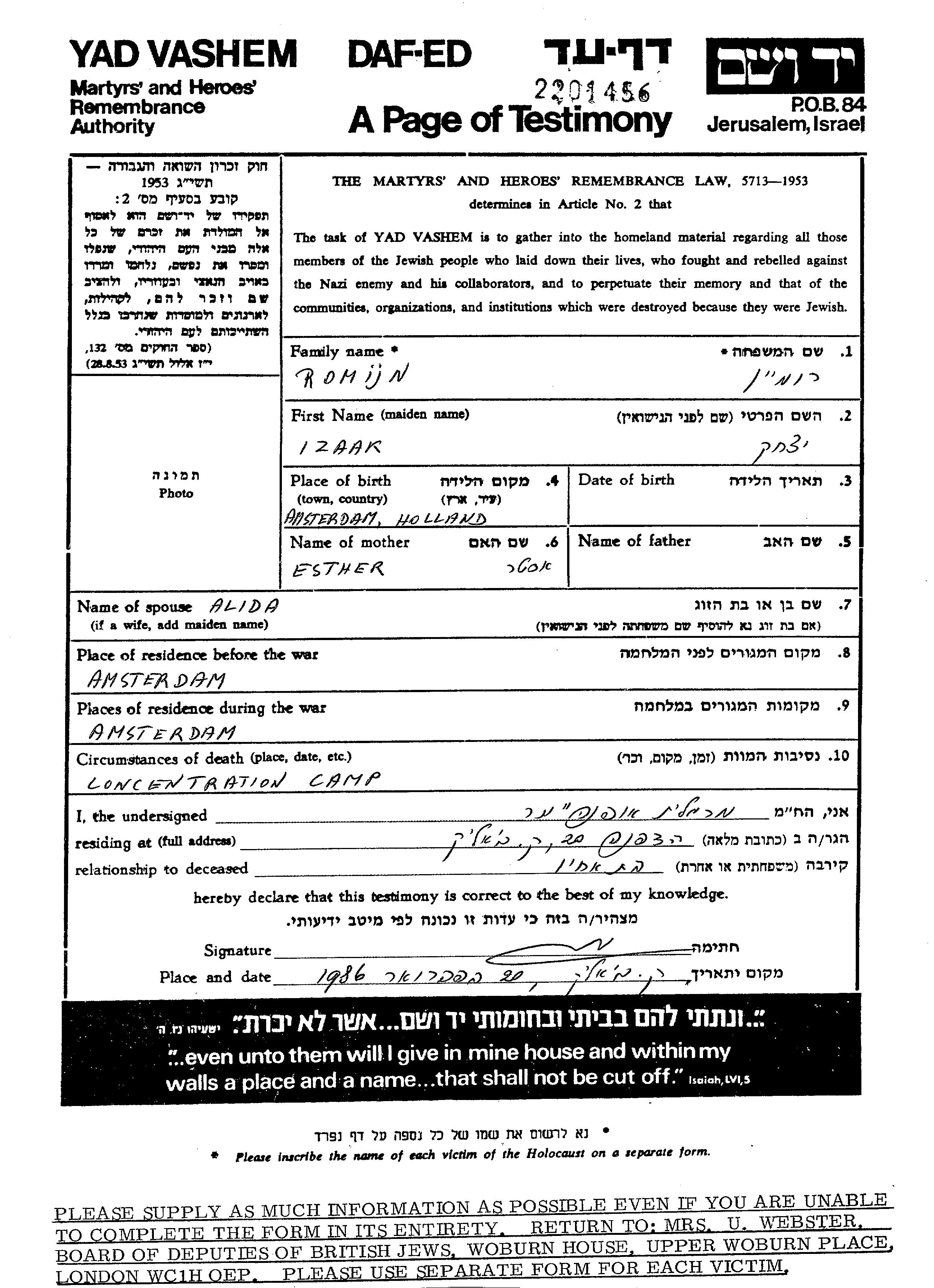 Romijn Isaac 1895 Amsterdam, Niederlande Gedenkblatt