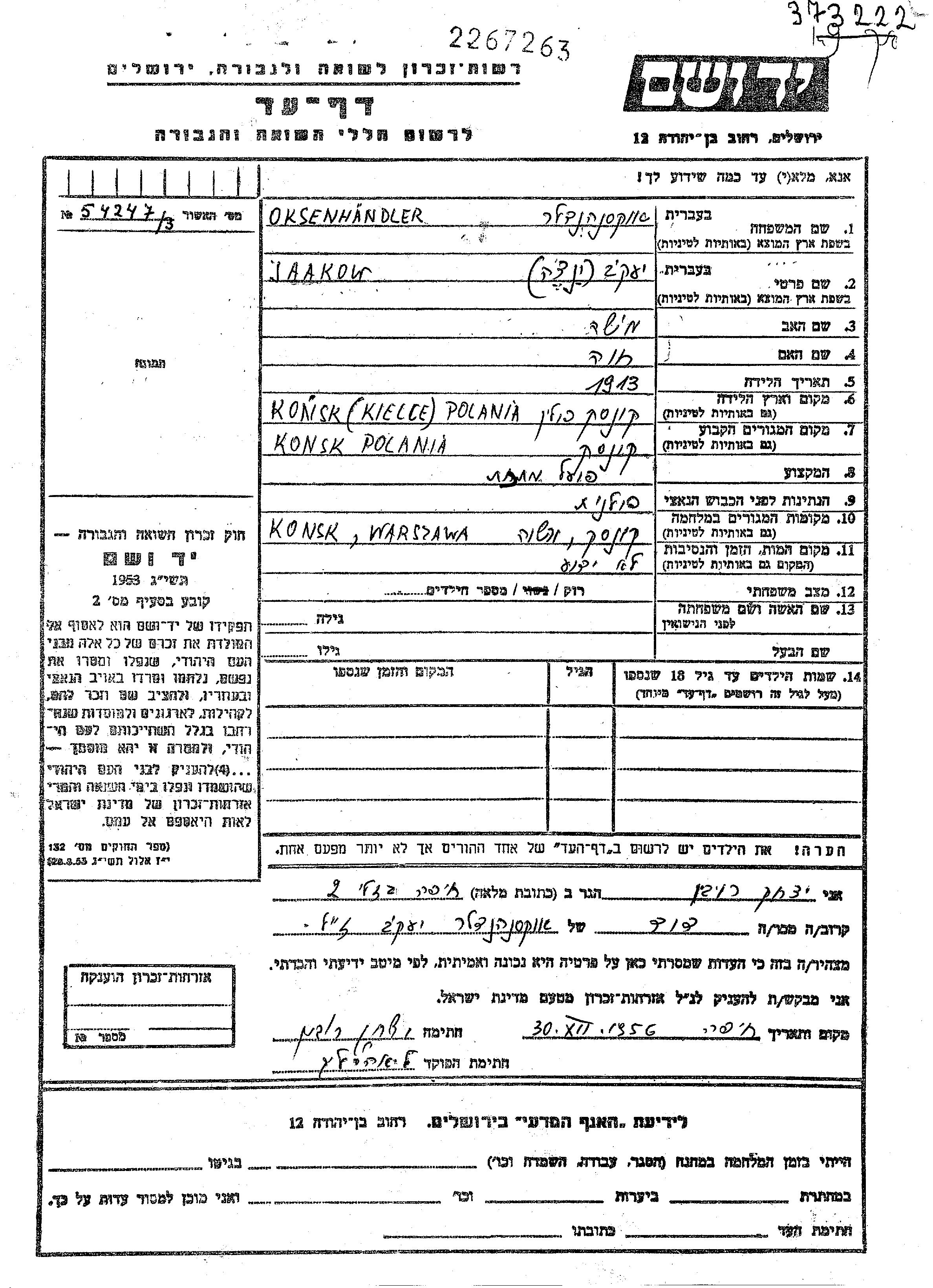 | Oksenhendler | Yaakov | Konsk, Polen | Gedenkblatt | |