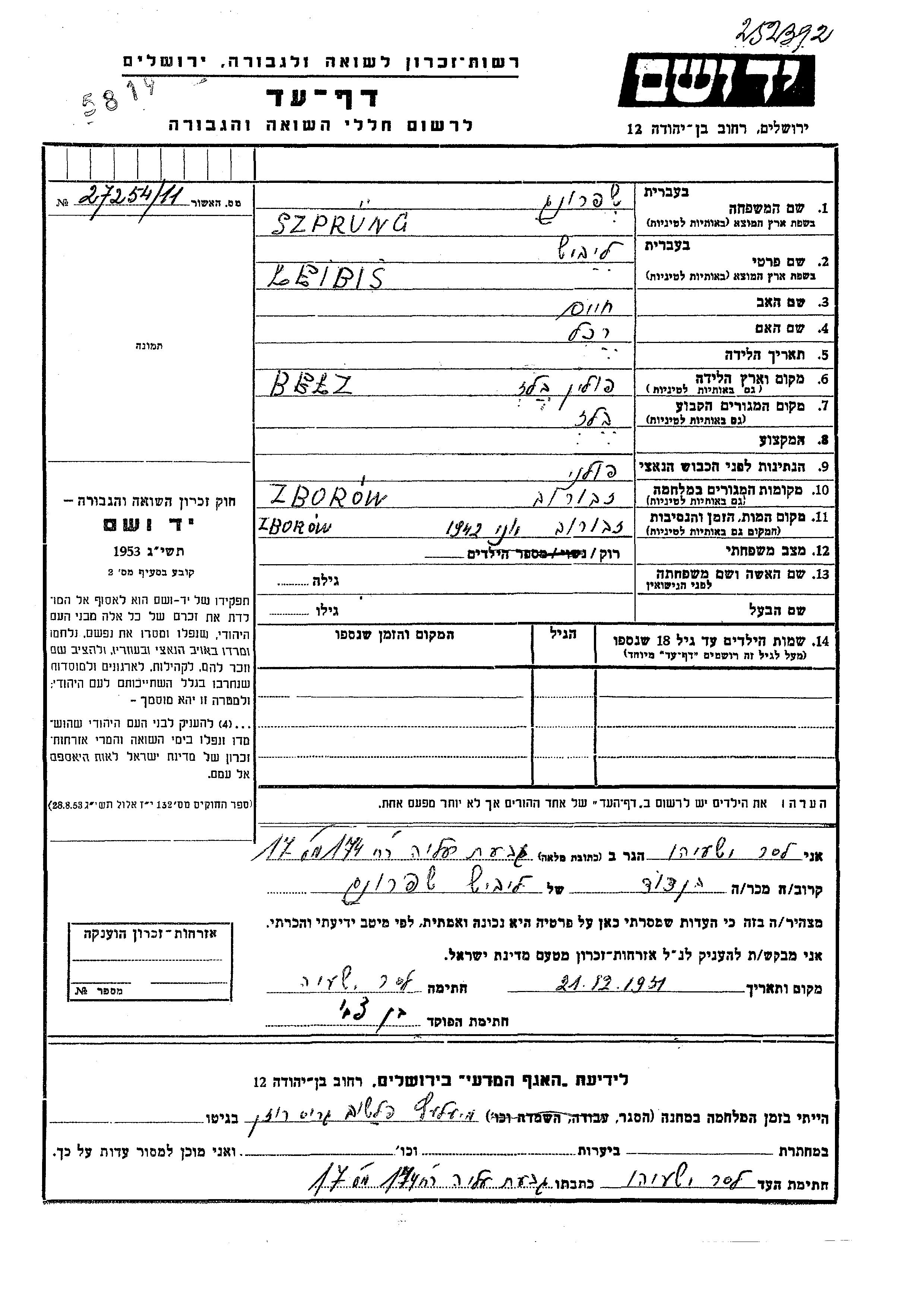 Leibis Szprung wurde in Belz, Polen geboren. Vor dem Zweiten Weltkrieg lebte er in Belz, Polen.