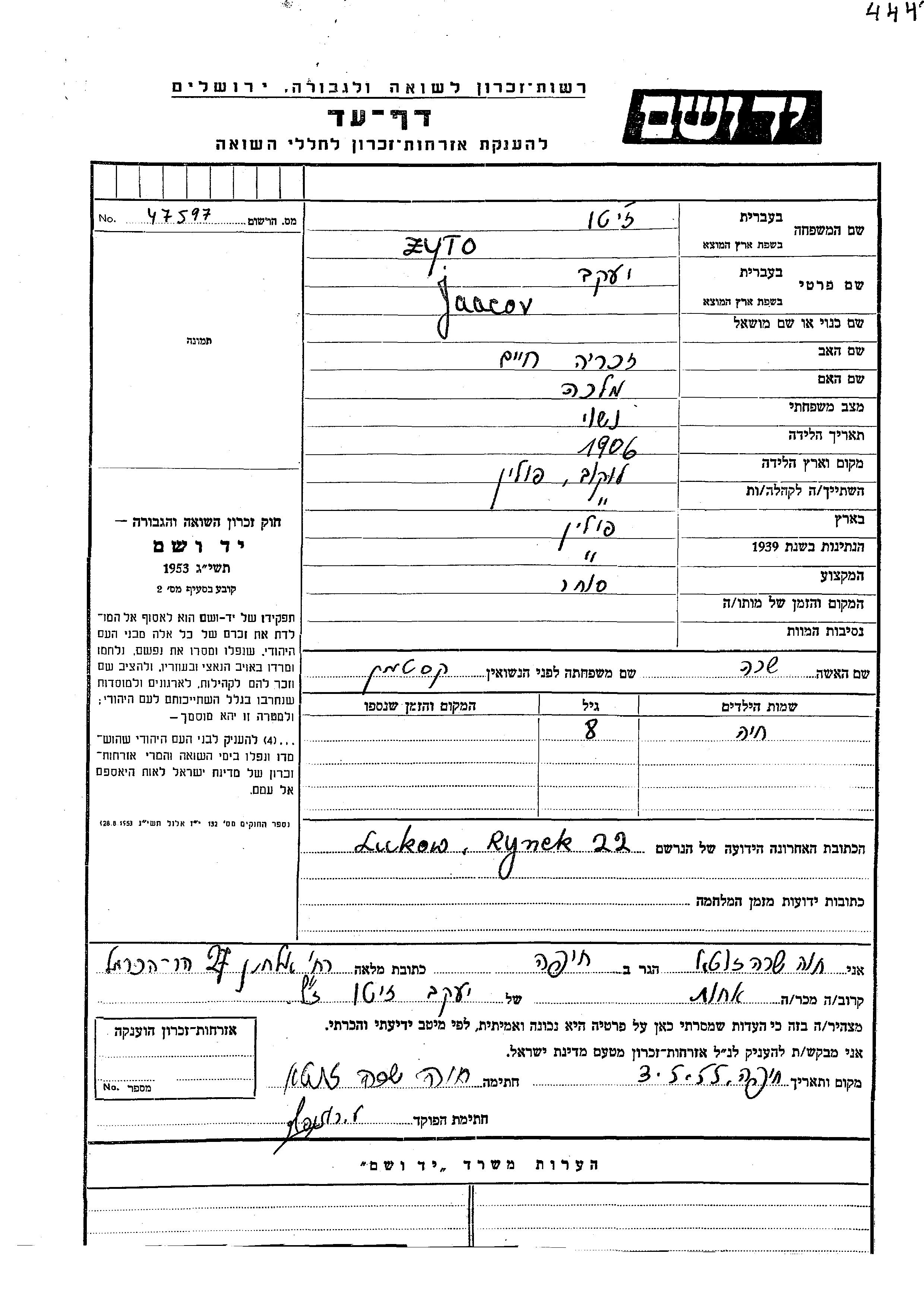Yaacov Zyto wurde im Jahr 1906 in Lukow, Polen geboren. Er war Kaufmann/-frau. Vor dem Zweiten Weltkrieg lebte er in Lukow, Polen.