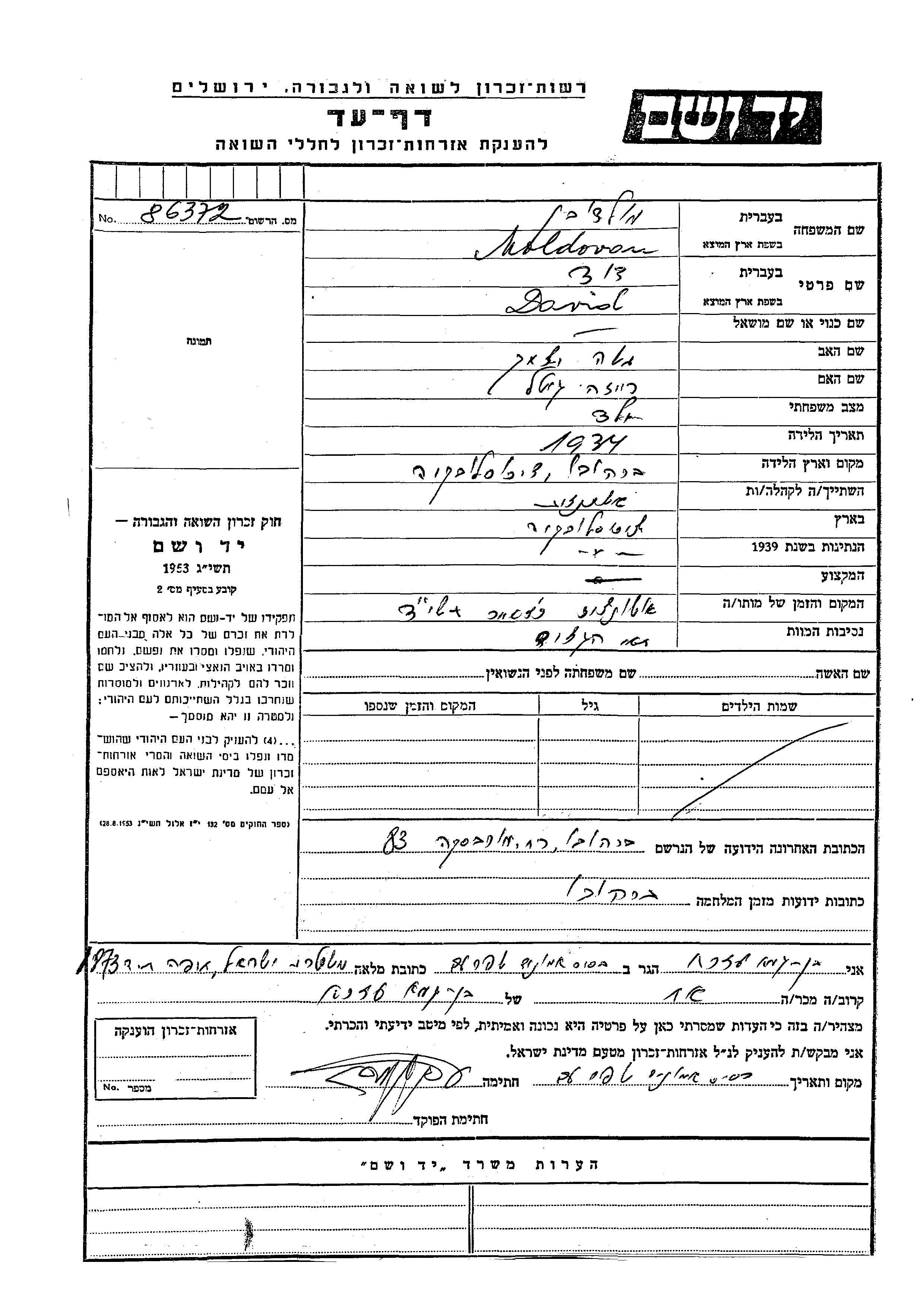 David Moldovan wurde im Jahr 1934 in Berehovo, Tschechoslowakei geboren. Vor dem Zweiten Weltkrieg lebte er in Berehovo, Tschechoslowakei.
