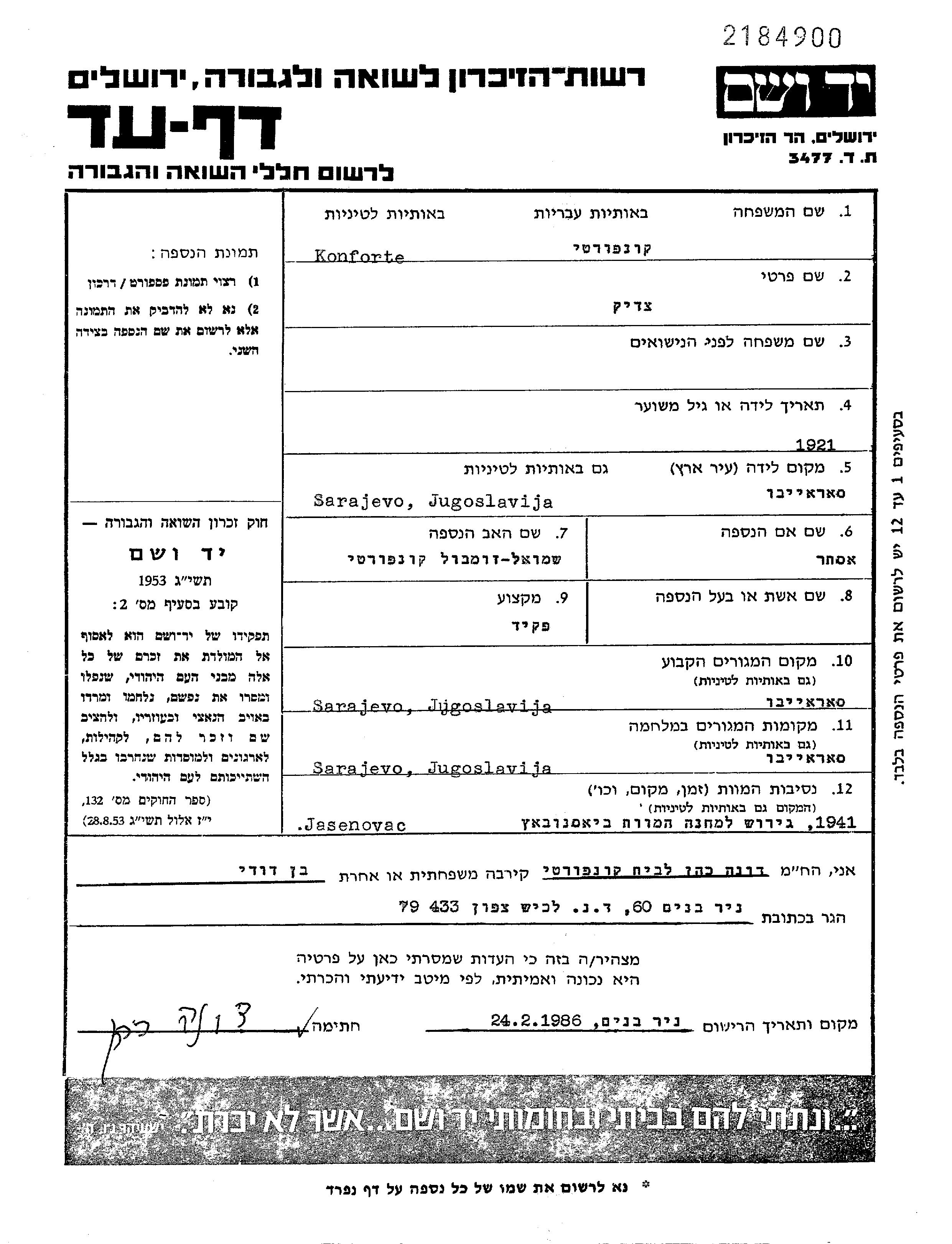 Cadik Konforte wurde im Jahr 1921 in Sarajevo, Jugoslawien geboren. Er war Angestellte/-r. Vor dem Zweiten Weltkrieg lebte er in Sarajevo, Jugoslawien.