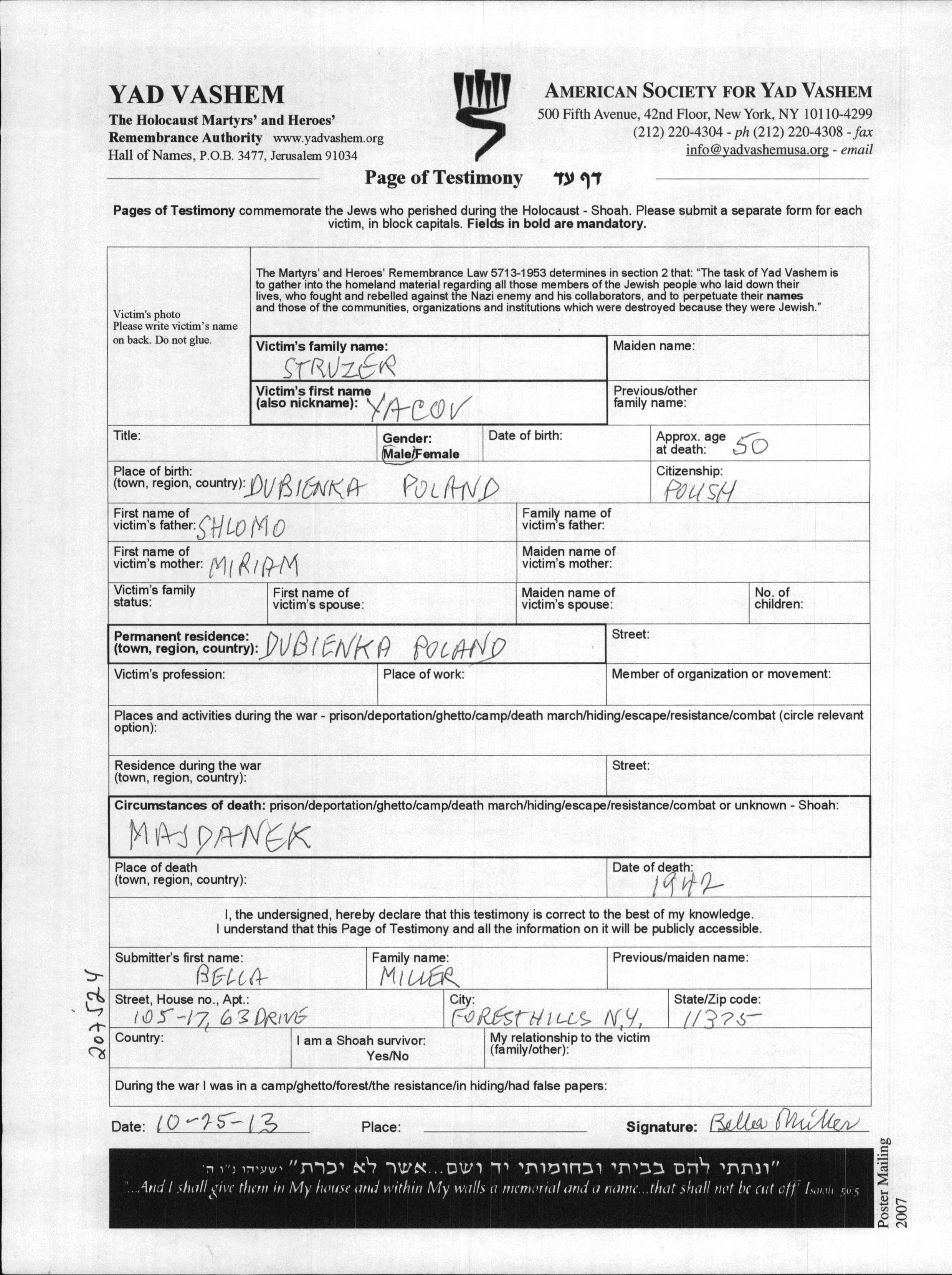 Yacov Struzer wurde im Jahr 1900 in Dubienka, Polen geboren. Er war Friseur/-in. Vor dem Zweiten Weltkrieg lebte er in Dubienka, Polen.