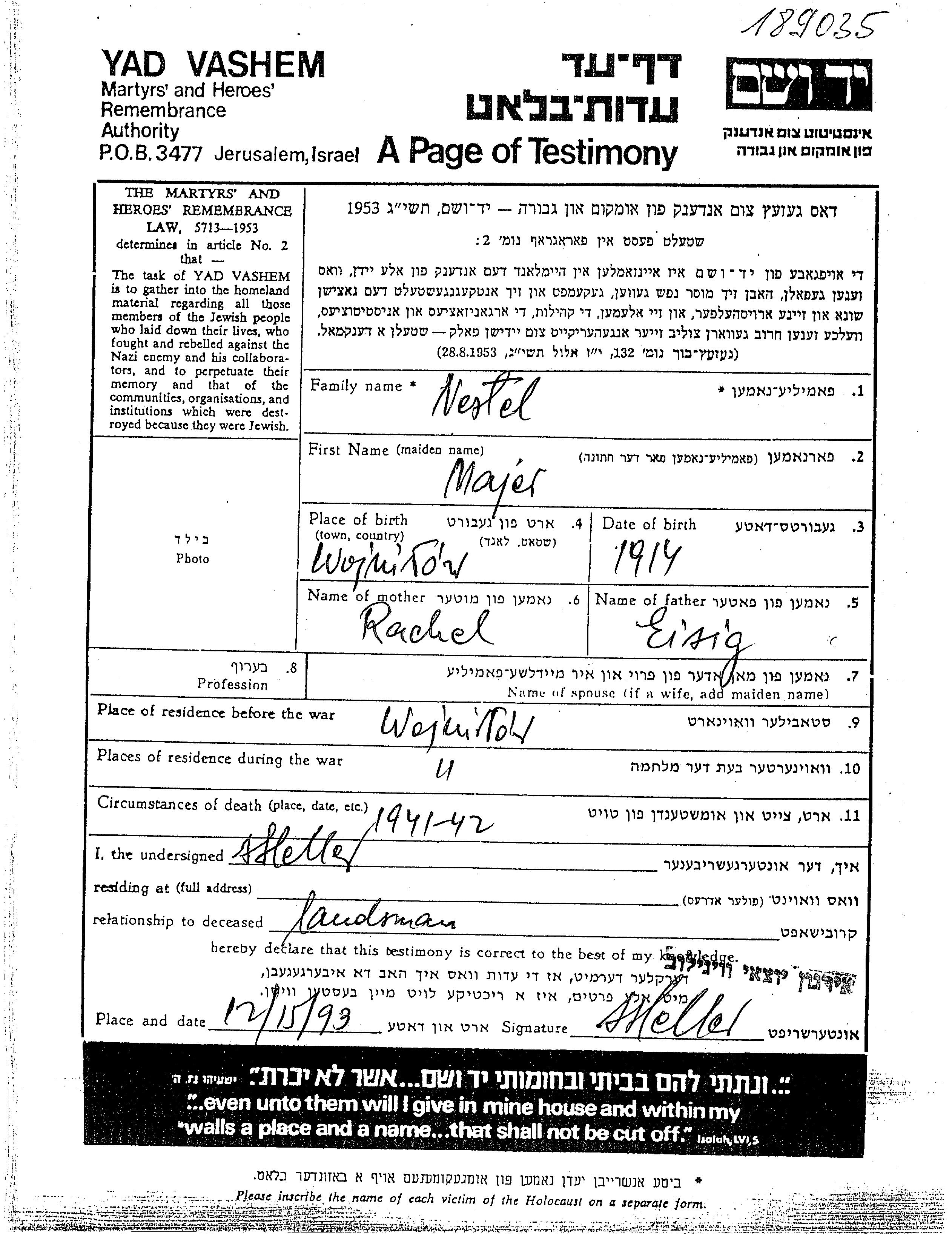 Majer Nestel wurde im Jahr 1914 in Wojnilow, Polen geboren. Vor dem Zweiten Weltkrieg lebte er in Wojnilow, Polen.