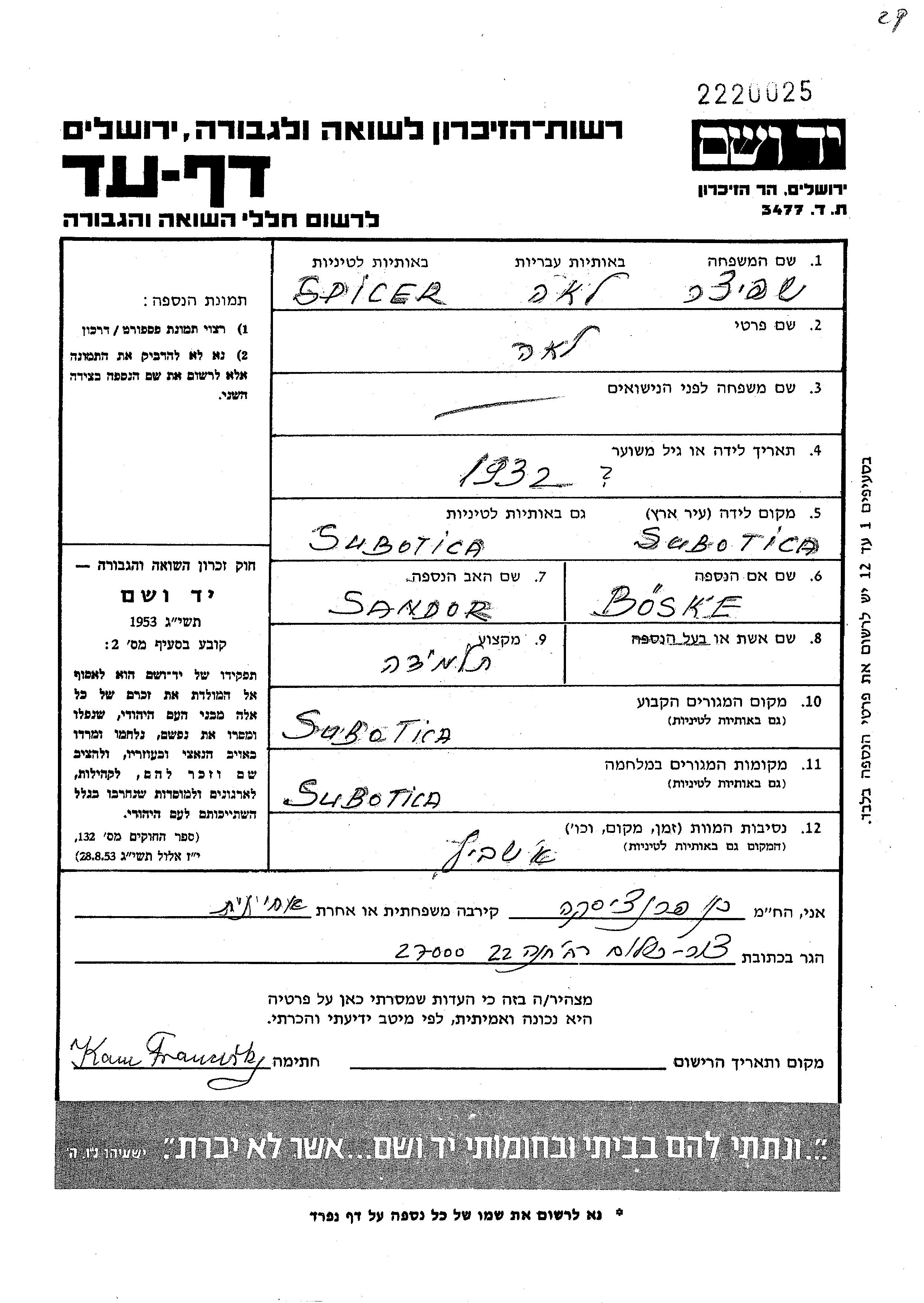 Lea Spitzer wurde im Jahr 1932 in Subotica, Jugoslawien geboren. Sie war Schüler/-in. Vor dem Zweiten Weltkrieg lebte sie in Subotica, Jugoslawien.