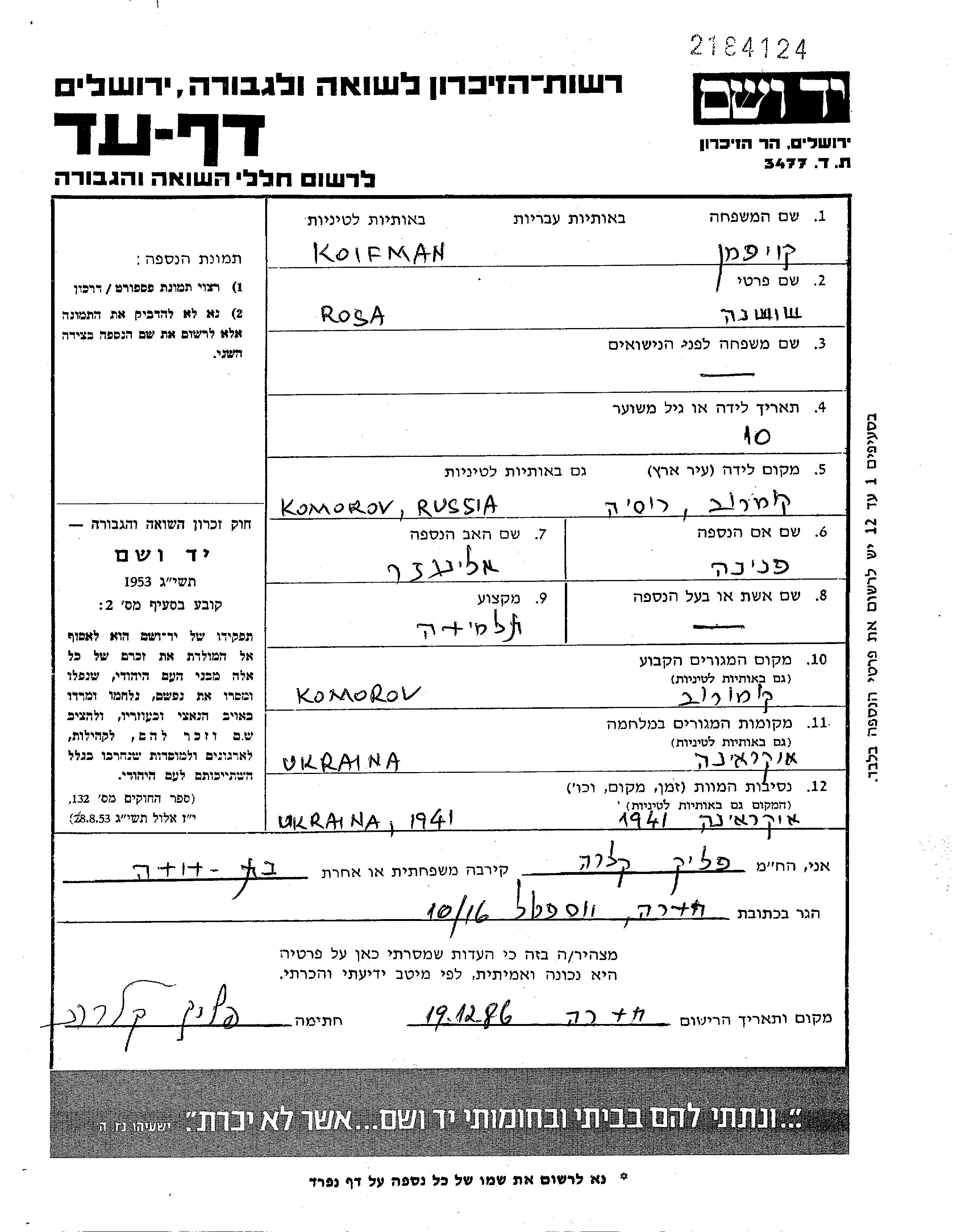 Koifman Rosa Shoshana Comarova, Rumänien Gedenkblatt