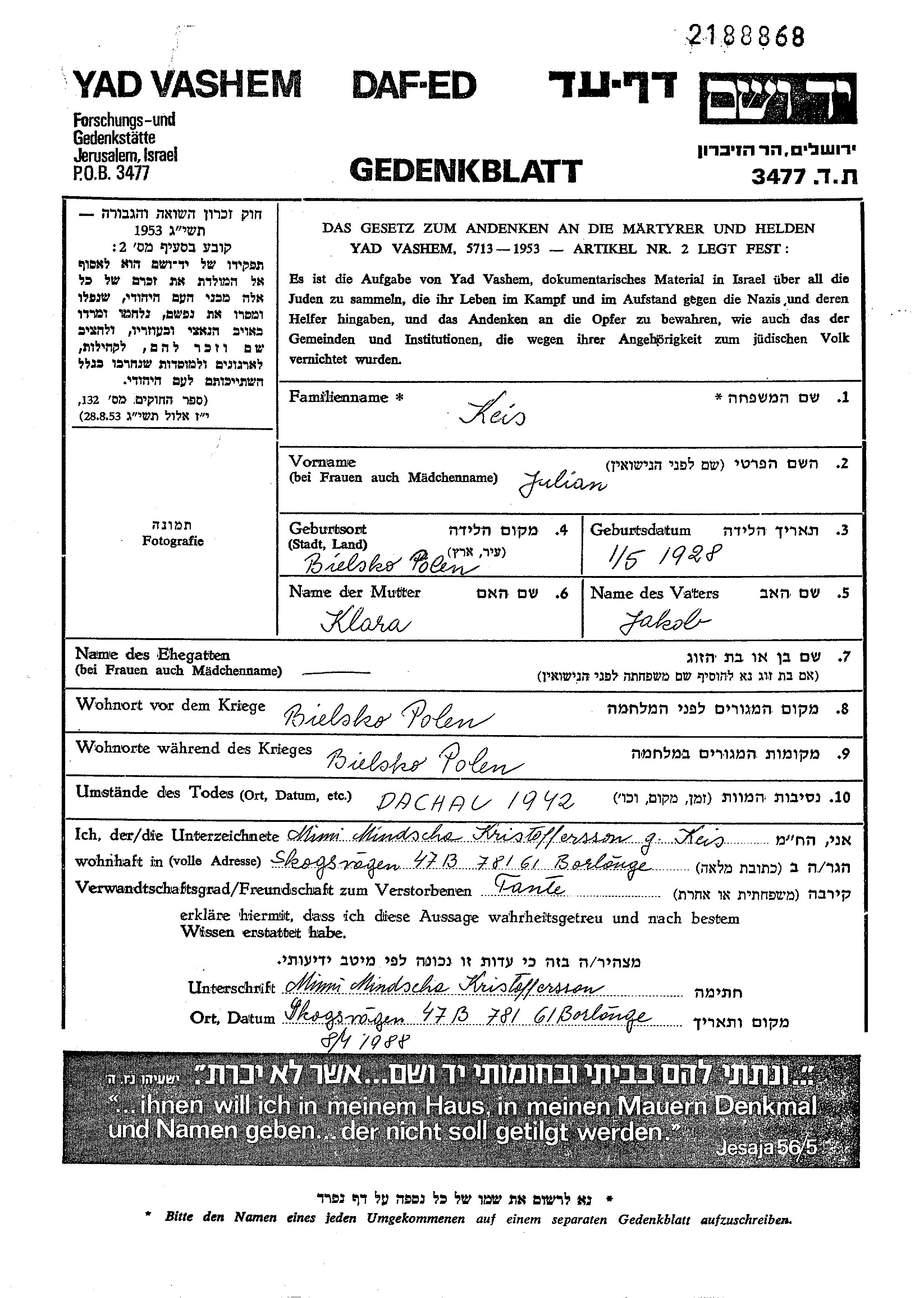 Keis Julian 1928 Bielsko, Polen Gedenkblatt