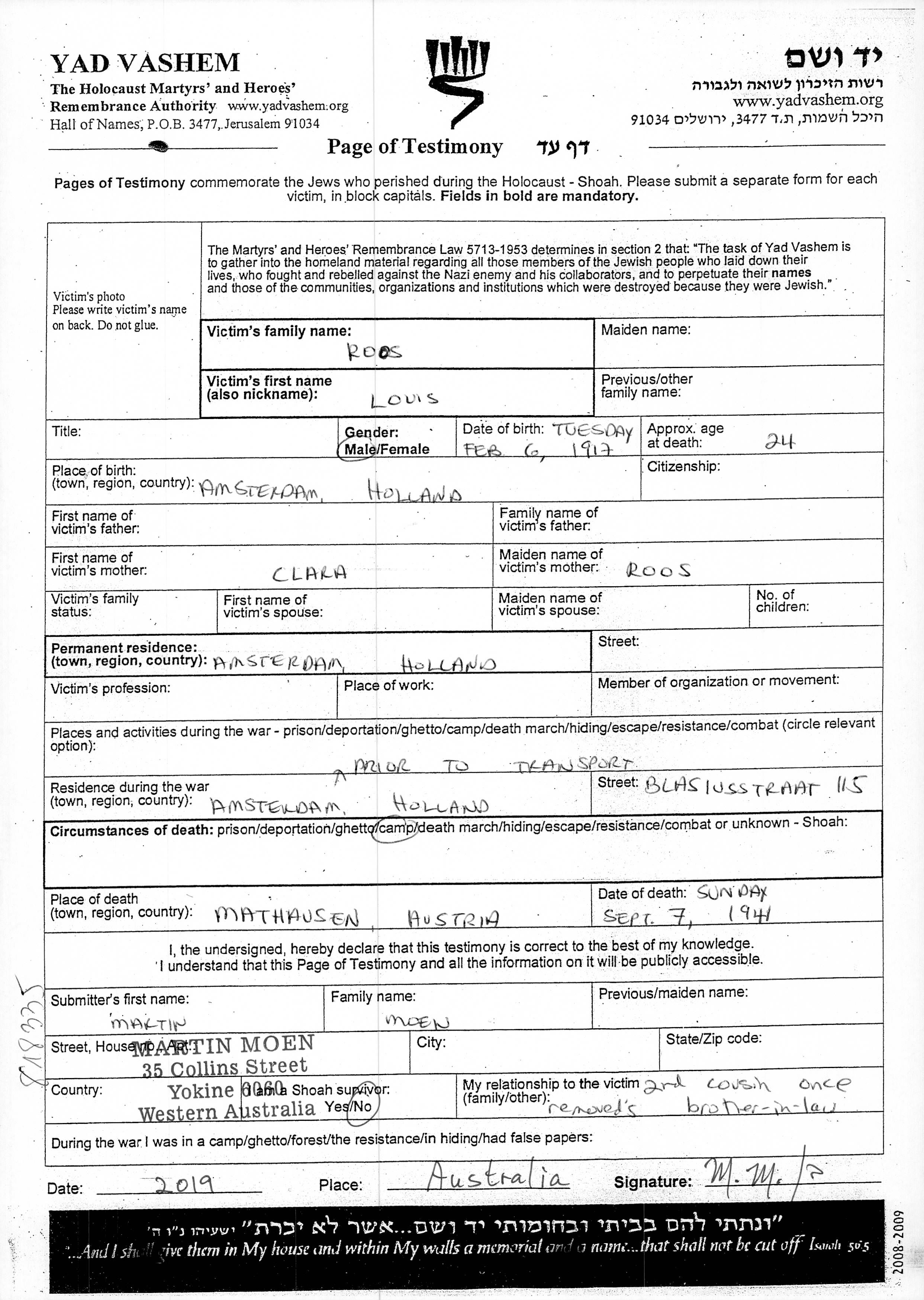 Roos Louis 1917 Amsterdam, Niederlande Liste von ermordeten Juden aus Holland