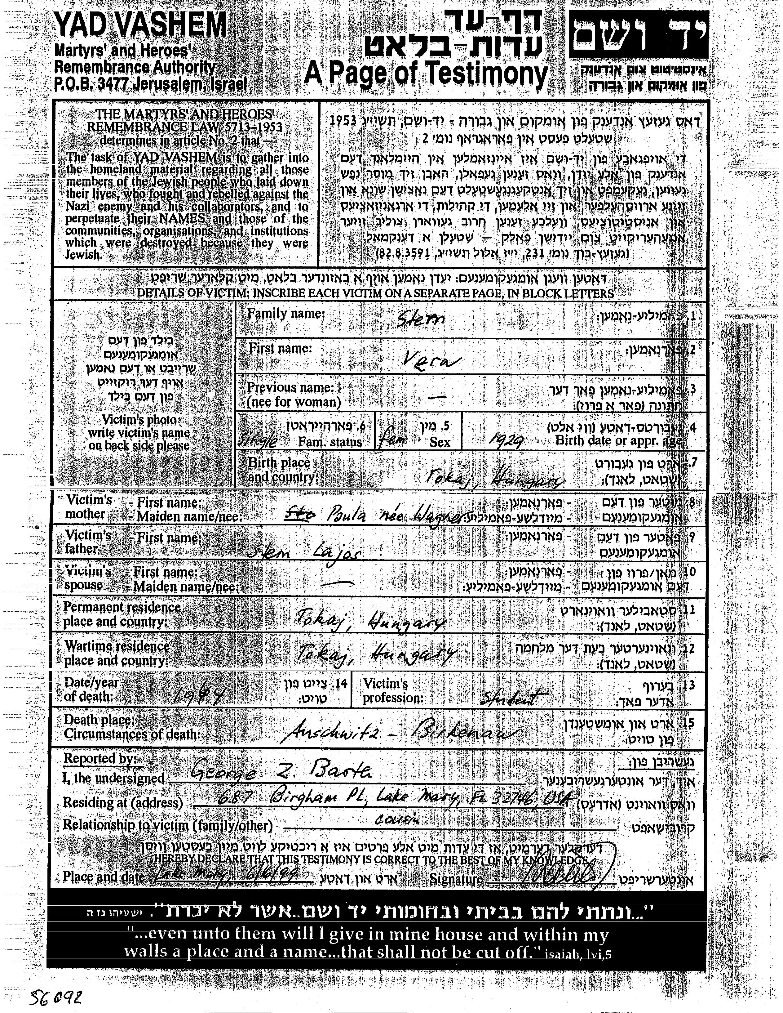 Vera Stern wurde im Jahr 1929 in Tokaj, Ungarn geboren. Sie war Student. Vor dem Zweiten Weltkrieg lebte sie in Tokaj, Ungarn.