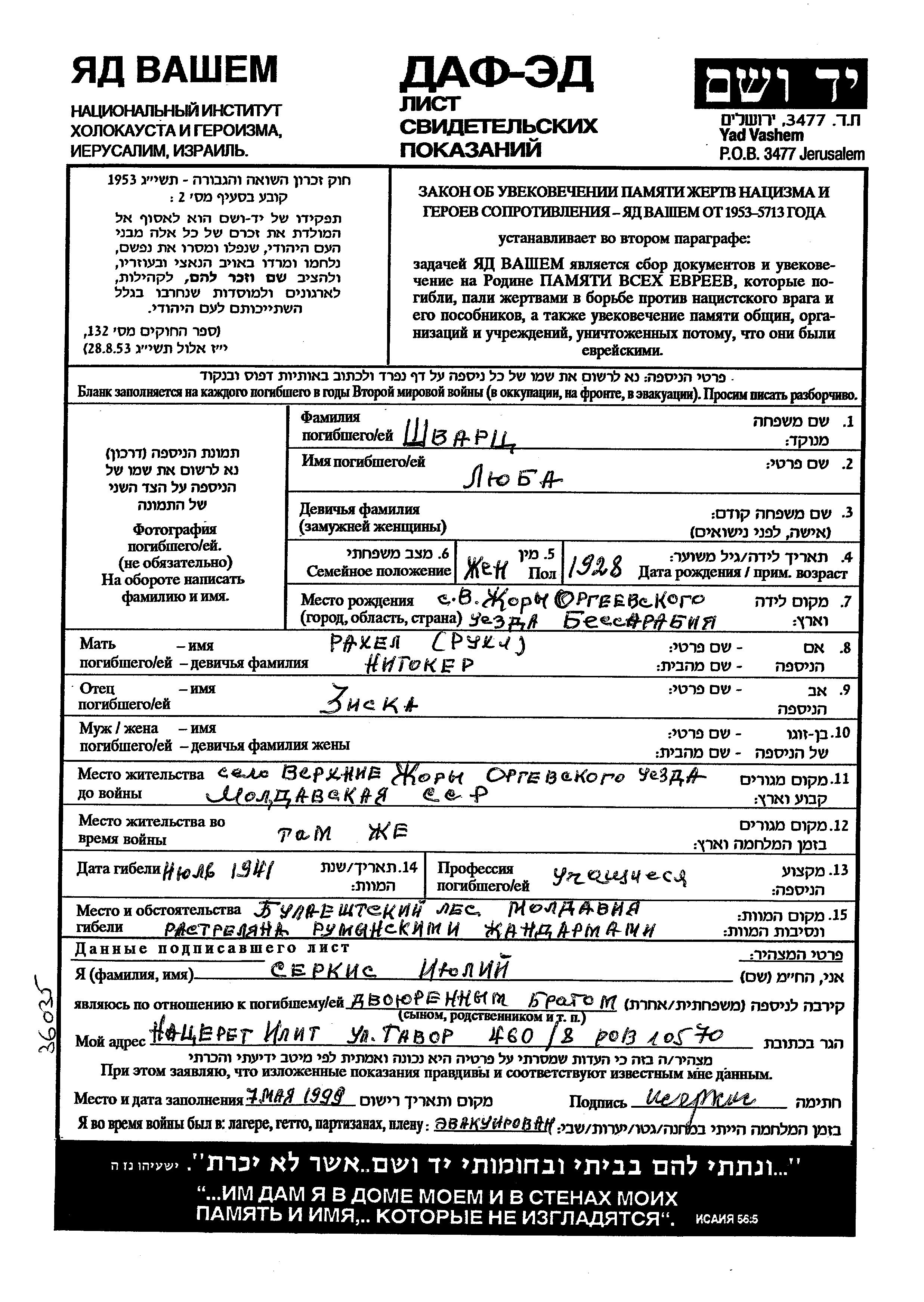 Lyuba wurde in der Schoah ermordet. Todesort: Bulayeshty, Rumänien im Jahr 1941.
