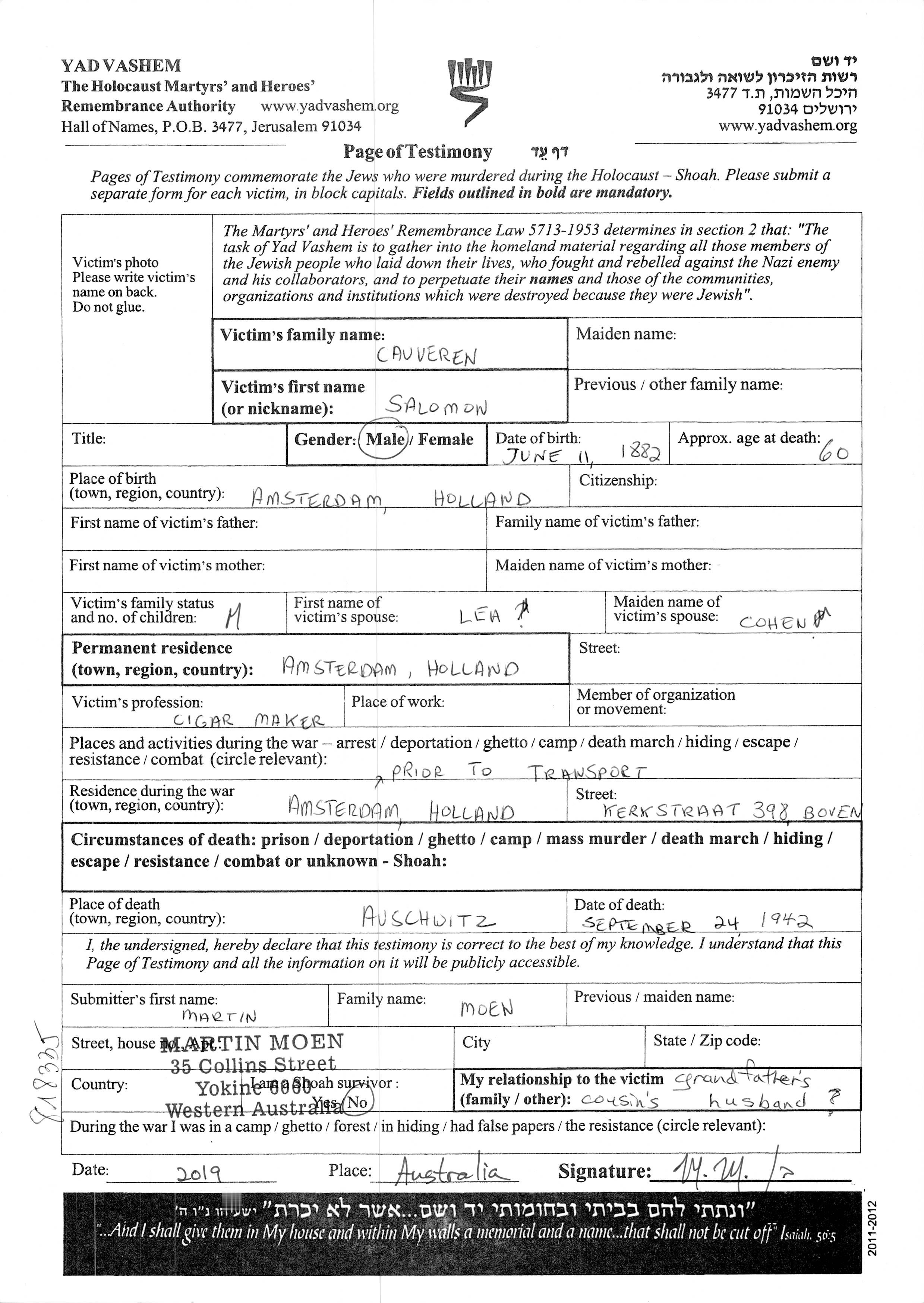 Cauveren | Salomon | 1882 | Amsterdam, Niederlande | Liste von ermordeten Juden aus Holland |