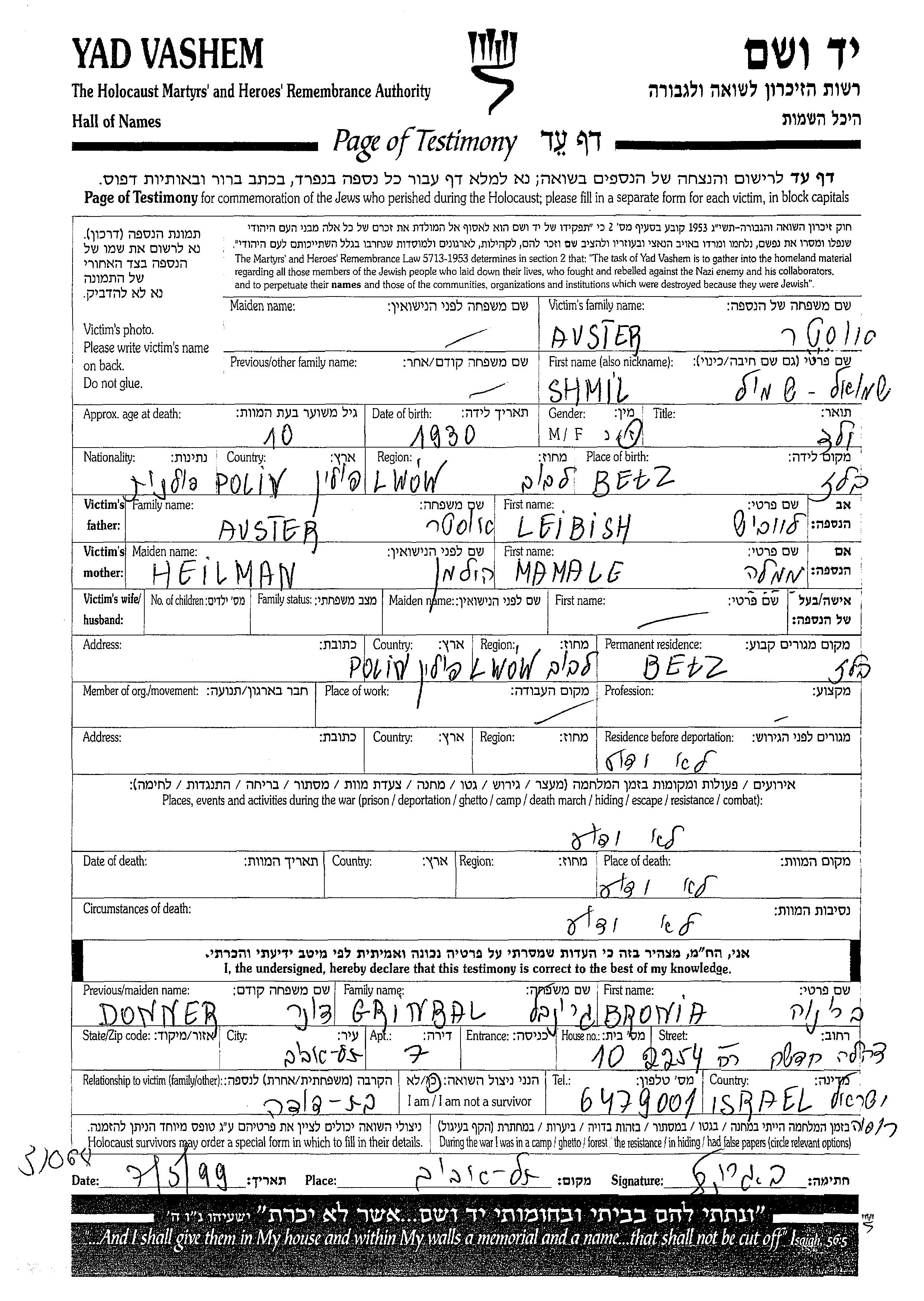 Shmil Auster Oster wurde im Jahr 1930 in Belz, Polen geboren. Vor dem Zweiten Weltkrieg lebte er in Belz, Polen.