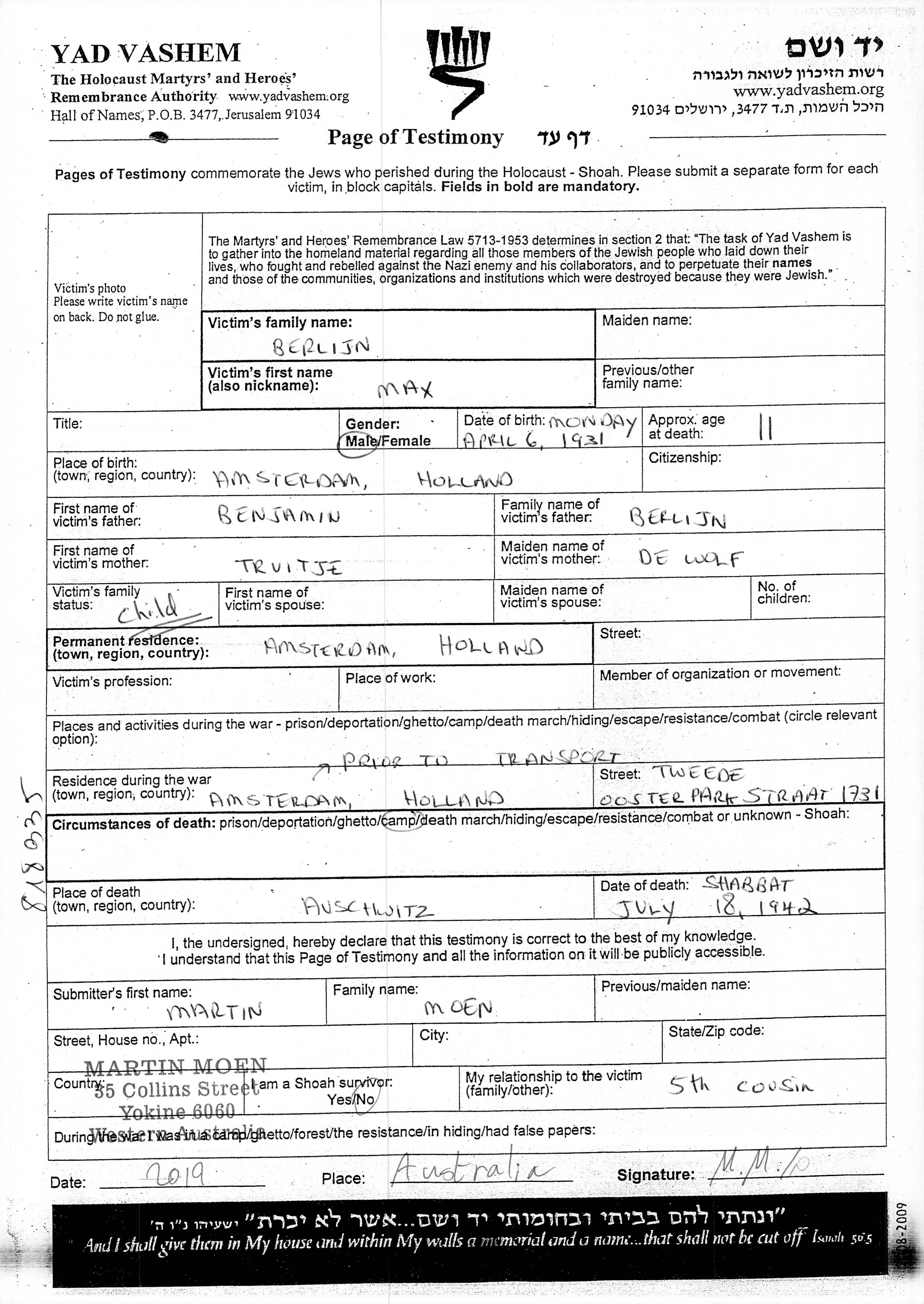 Berlijn Max 1931 Amsterdam, Niederlande Liste von ermordeten Juden aus Holland