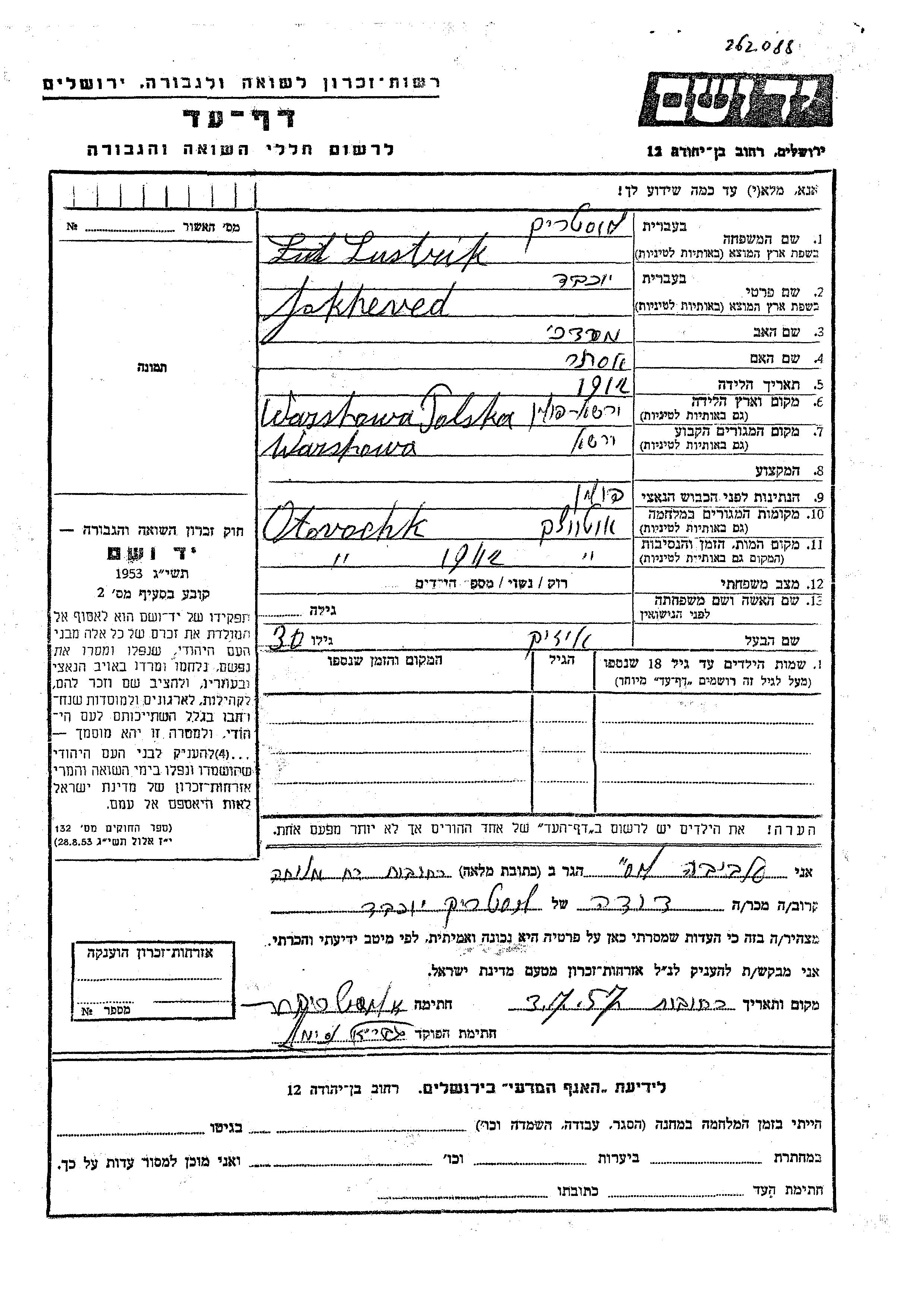 Jokheved Lustrik wurde im Jahr 1912 in Warsaw, Polen geboren. Sie war die Tochter von Mordekhai und Ester. Sie war mit Aizik Verheiratet. Vor dem Zweiten Weltkrieg lebte sie in Warsaw, Polen. Während des Krieges war sie in Otwock, Polen.