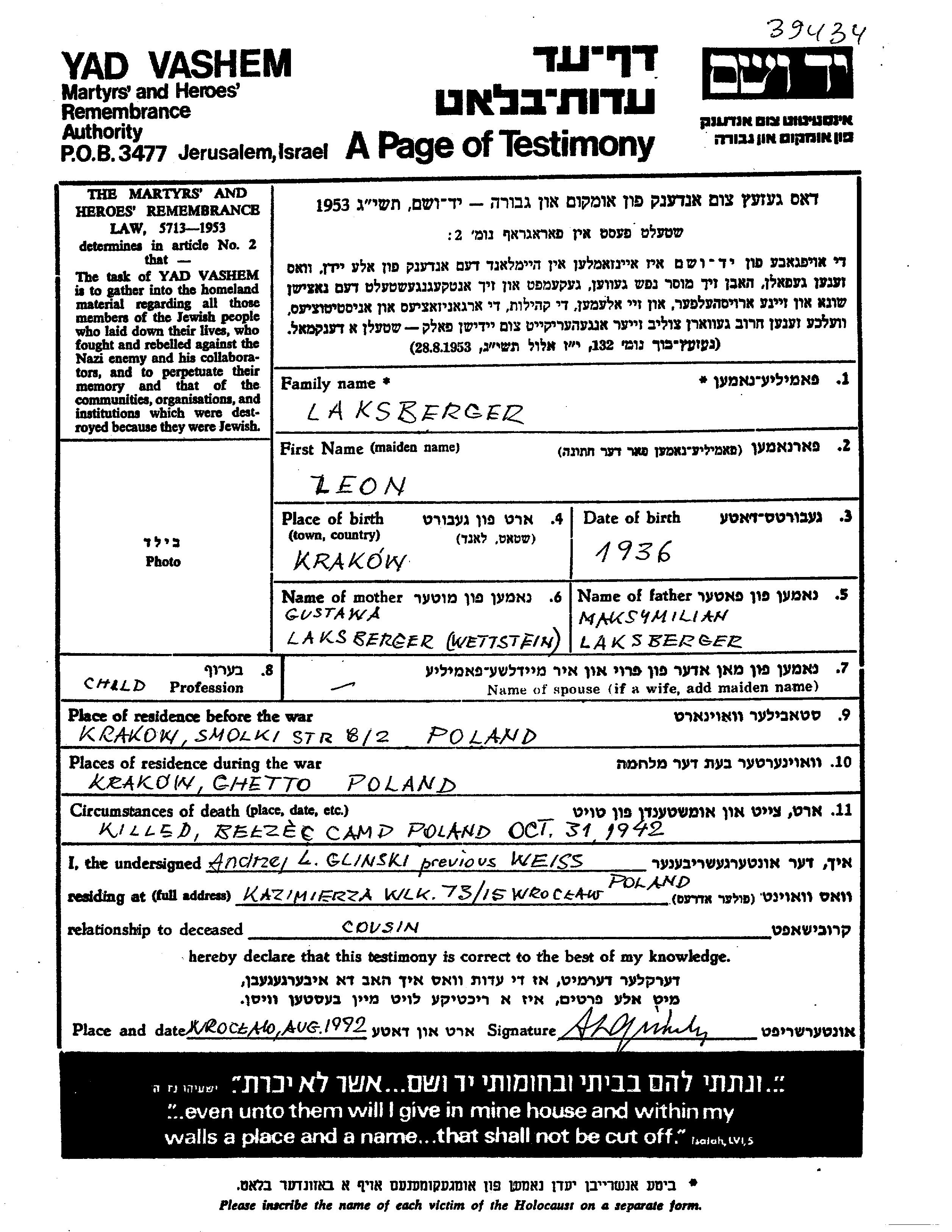 Leon wurde in der Schoah ermordet. Todesort: Belzec, Polen im Jahr 31/10/1942.