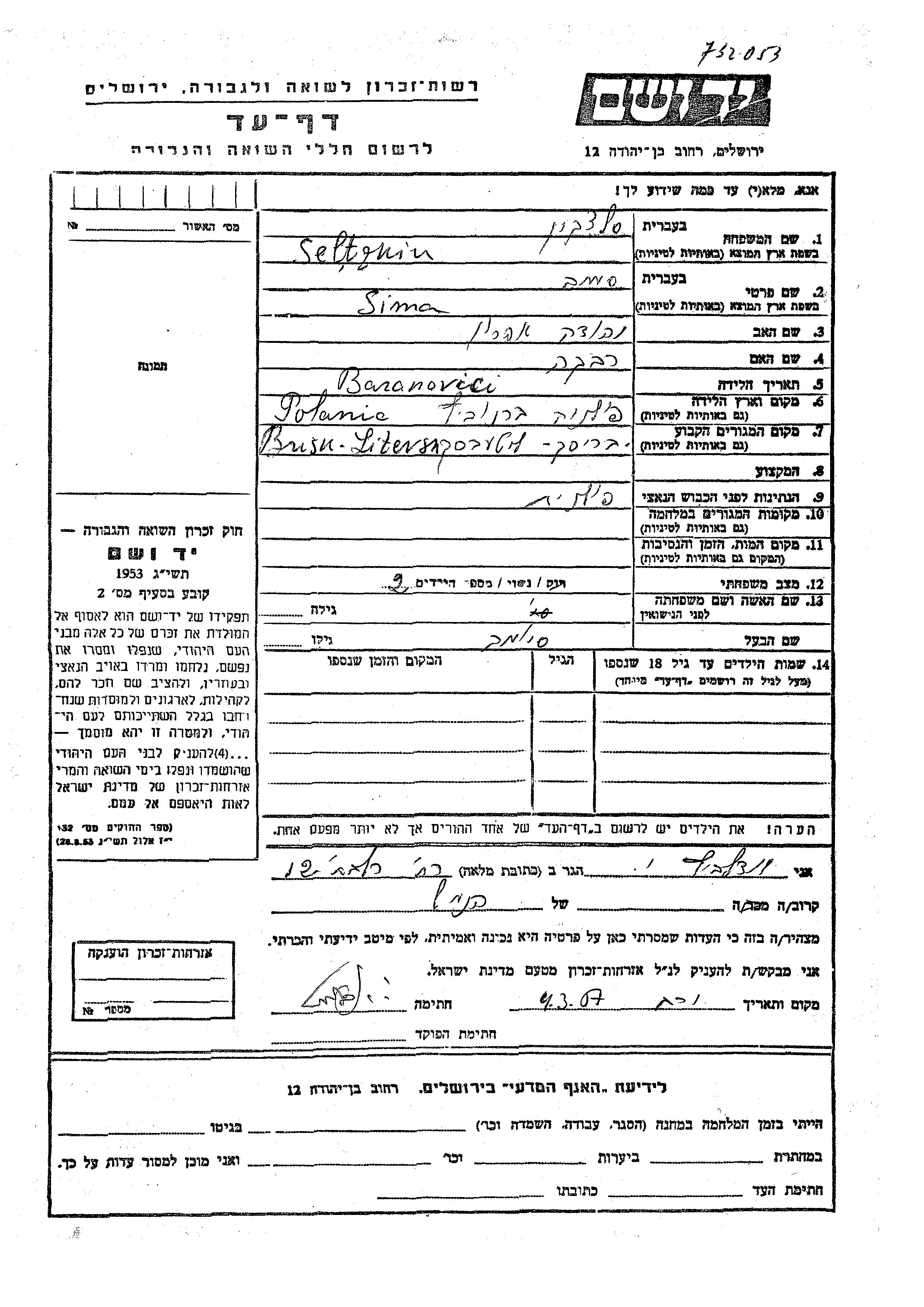 Sima Seltzkin wurde in Baranovich, Polen geboren. Sie war die Tochter von Yehuda Aharon und Rivka. Sie war mit Sioma Verheiratet. Vor dem Zweiten Weltkrieg lebte sie in Brisk, Polen.