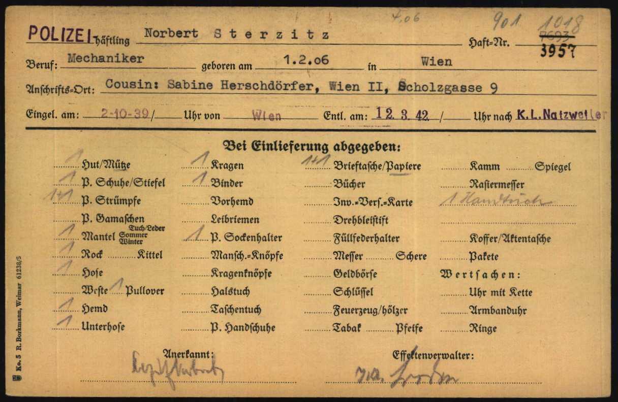 Sterzitz Norbert 1906 Wien, Österreich Kartei des Internationalen Suchdienstes Bad Arolsen