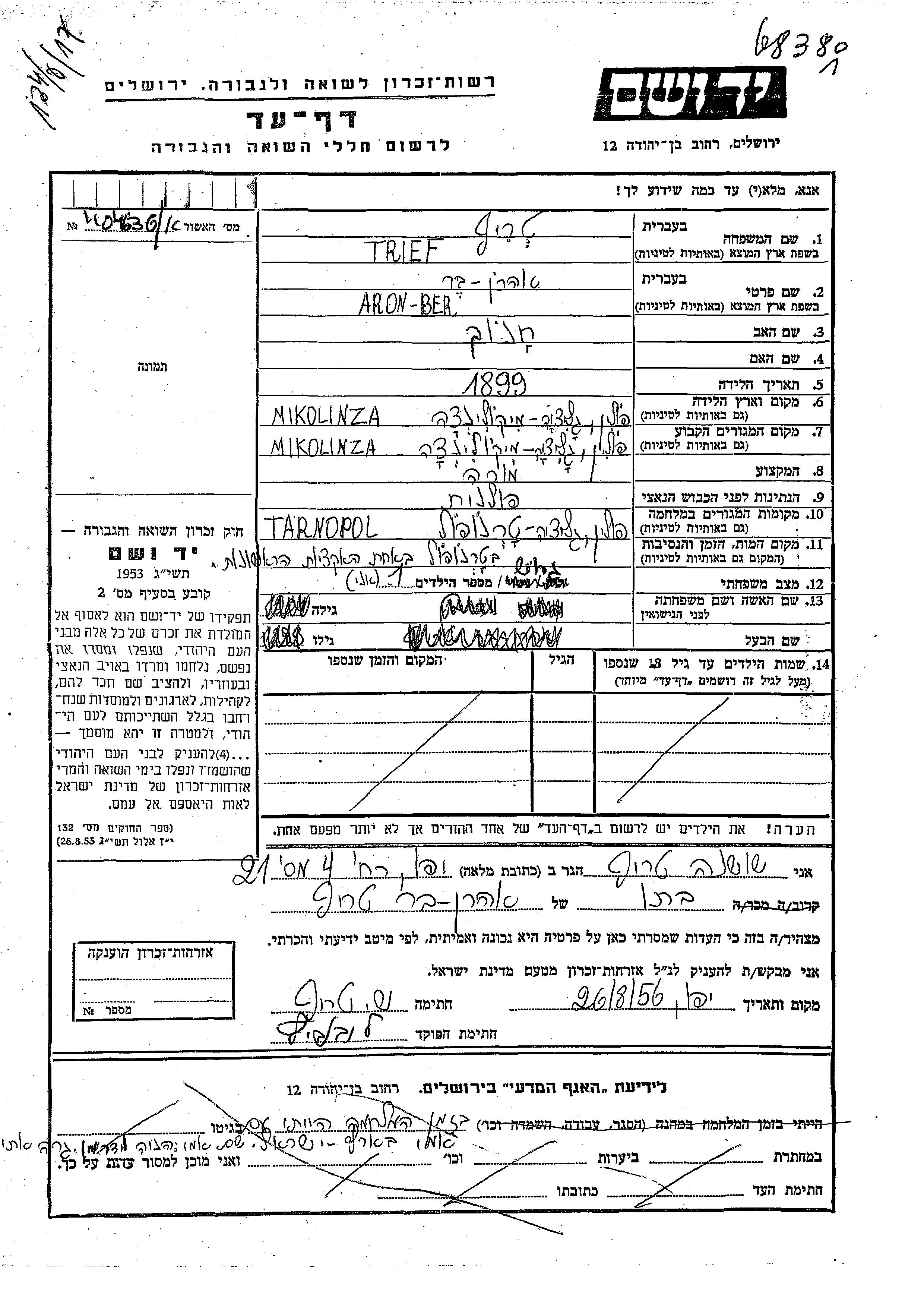 Aron Ber Trief wurde im Jahr 1899 in Mikolincze, Polen geboren. Er war der Sohn von Khanokh. Er war Lehrer/in und Geschieden. Vor dem Zweiten Weltkrieg lebte er in Mikolincze, Polen. Während des Krieges war er in Tarnopol, Polen.