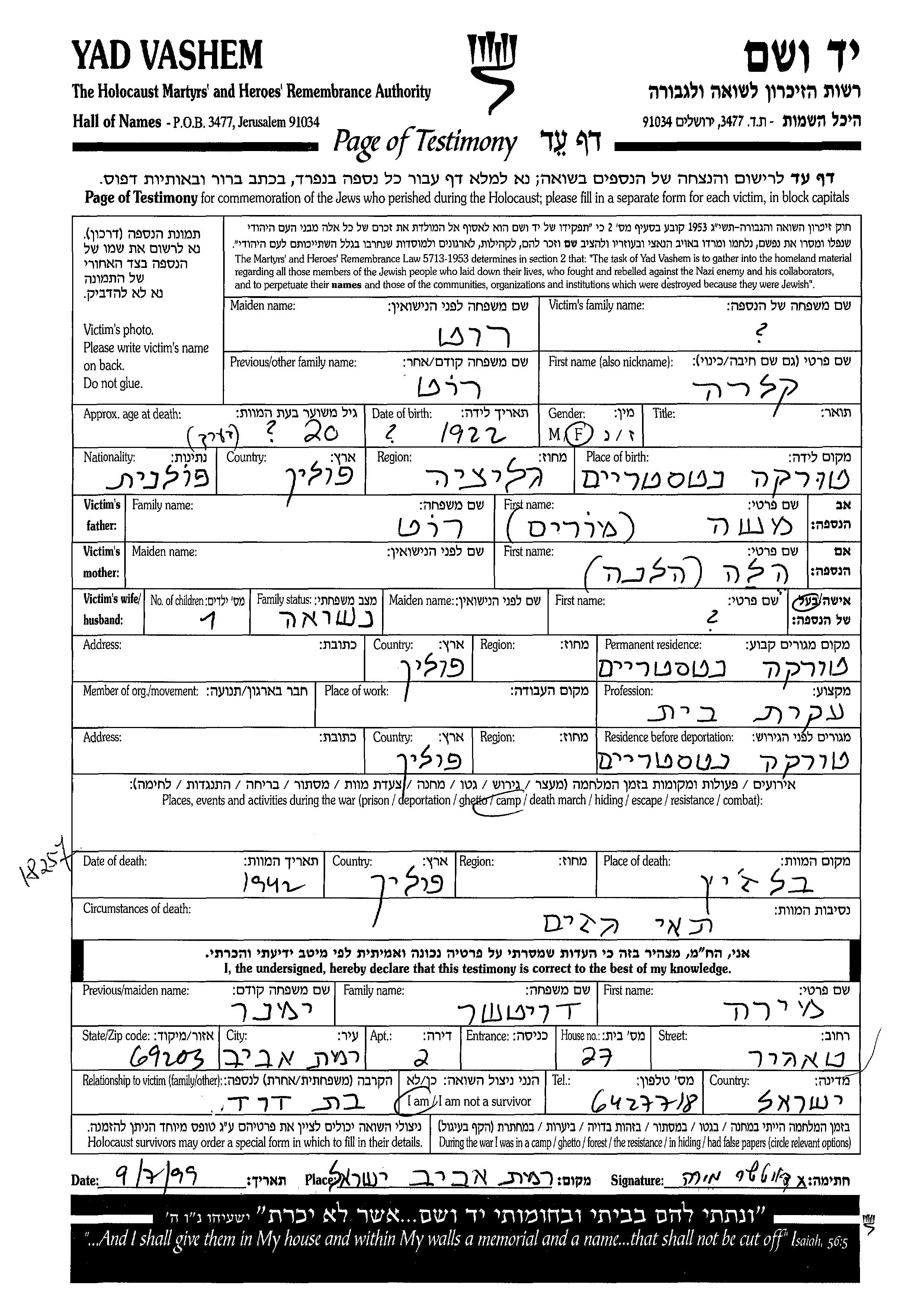 Klara Roth Name unbekannt Rut, geb. Rut wurde im Jahr 1922 in Turka nad Stryjem, Polen geboren. Sie war Hausfrau. Vor dem Zweiten Weltkrieg lebte sie in Turka, Polen.