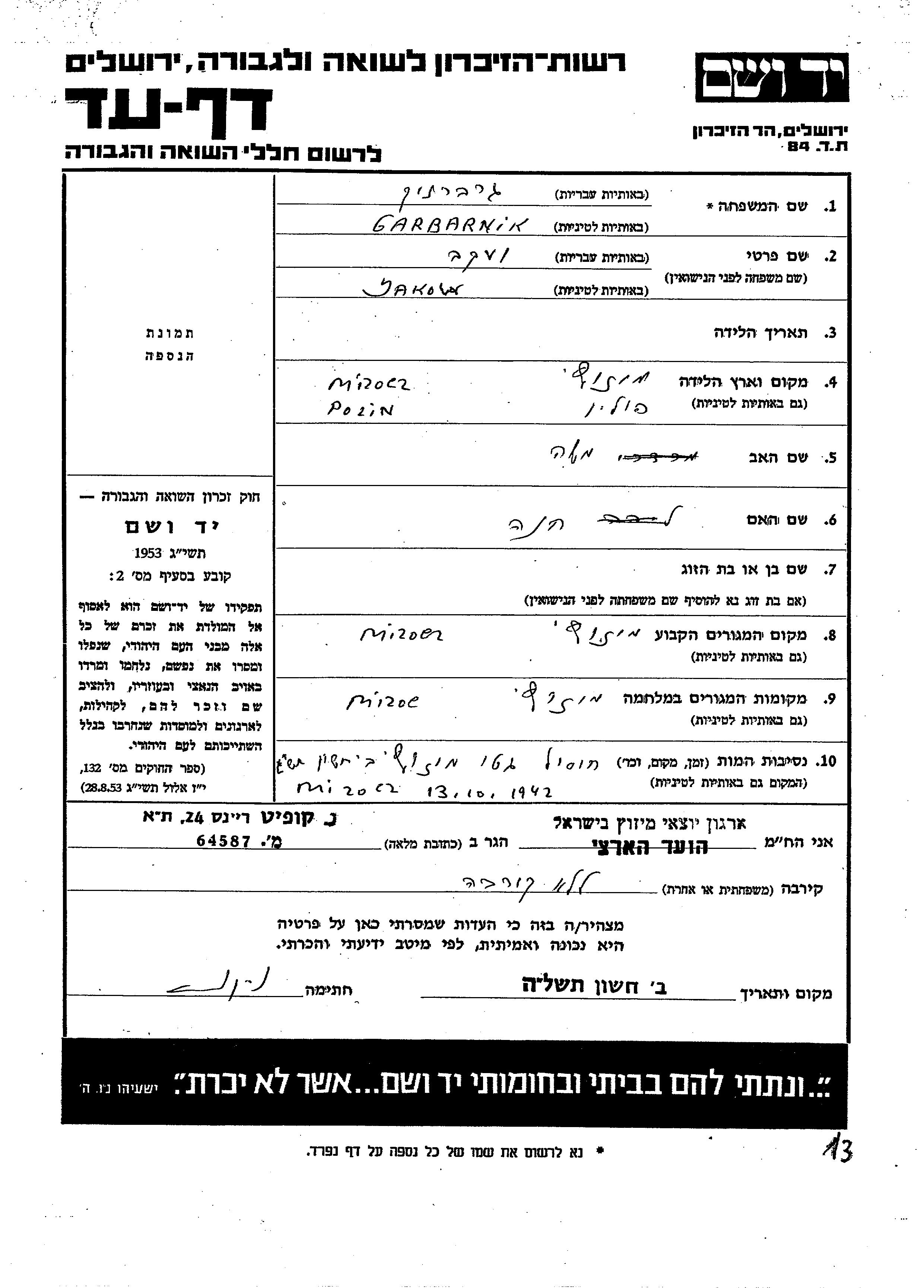 Jakow wurde in der Schoah ermordet. Todesort: Mizocz, Polen im Jahr 13/10/1942.
