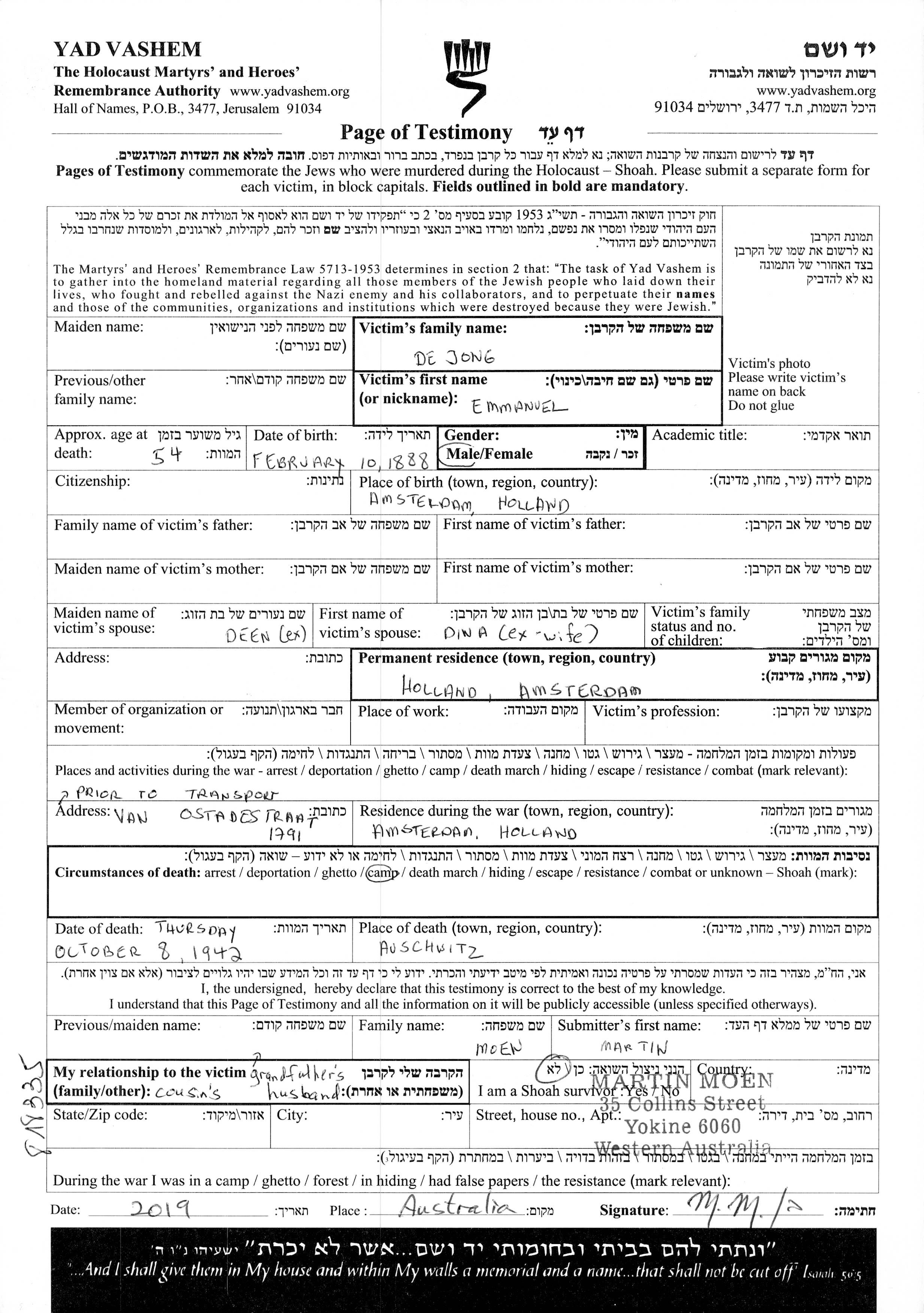Jong de | Emanuel | 1888 | Amsterdam, Niederlande | Liste von ermordeten Juden aus Holland |