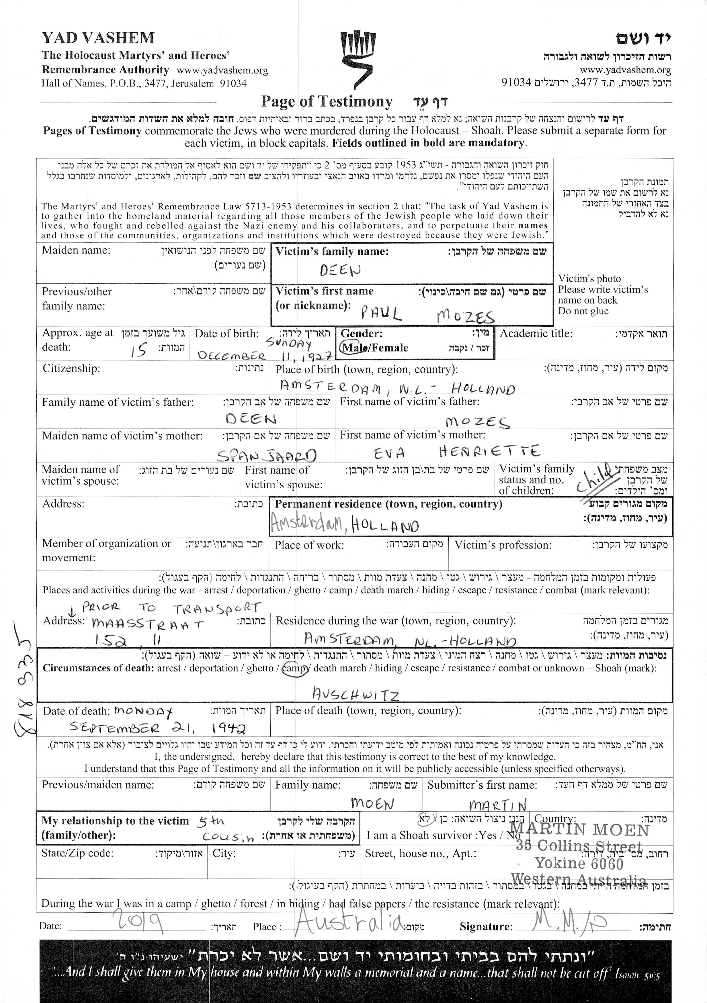 Deen Paul 1927 Amsterdam, Niederlande Liste von ermordeten Juden aus Holland