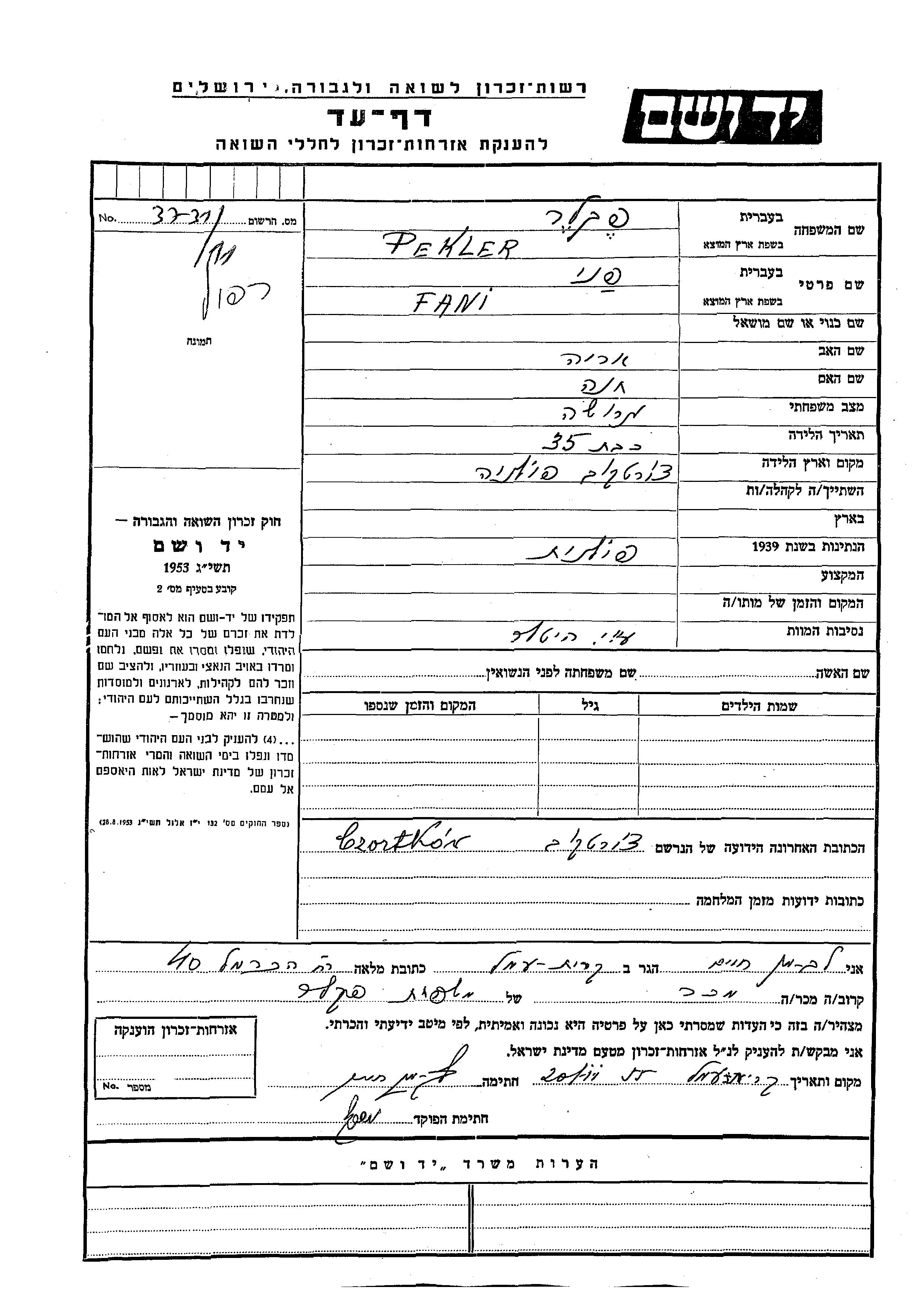 Fani Haberman Pekler Fekler, geb. Fekler wurde im Jahr 1907 in Czortkow, Polen geboren. Sie war Hausfrau. Vor dem Zweiten Weltkrieg lebte sie in Czortkow, Polen.