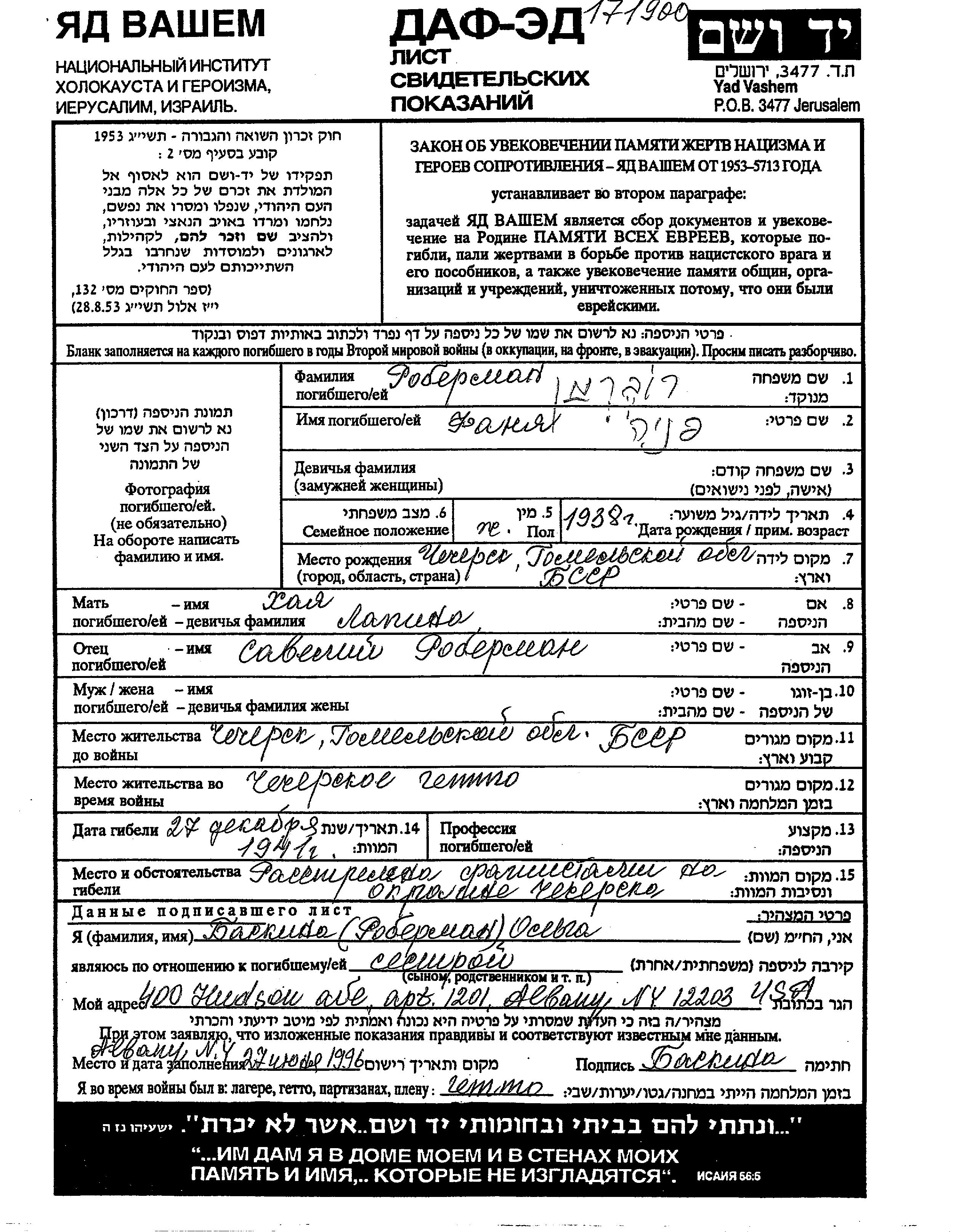 Fanya Roberman wurde im Jahr 1938 in Chechersk, Weißrussland (UdSSR) geboren. Vor dem Zweiten Weltkrieg lebte sie in Chechersk, Weißrussland (UdSSR).