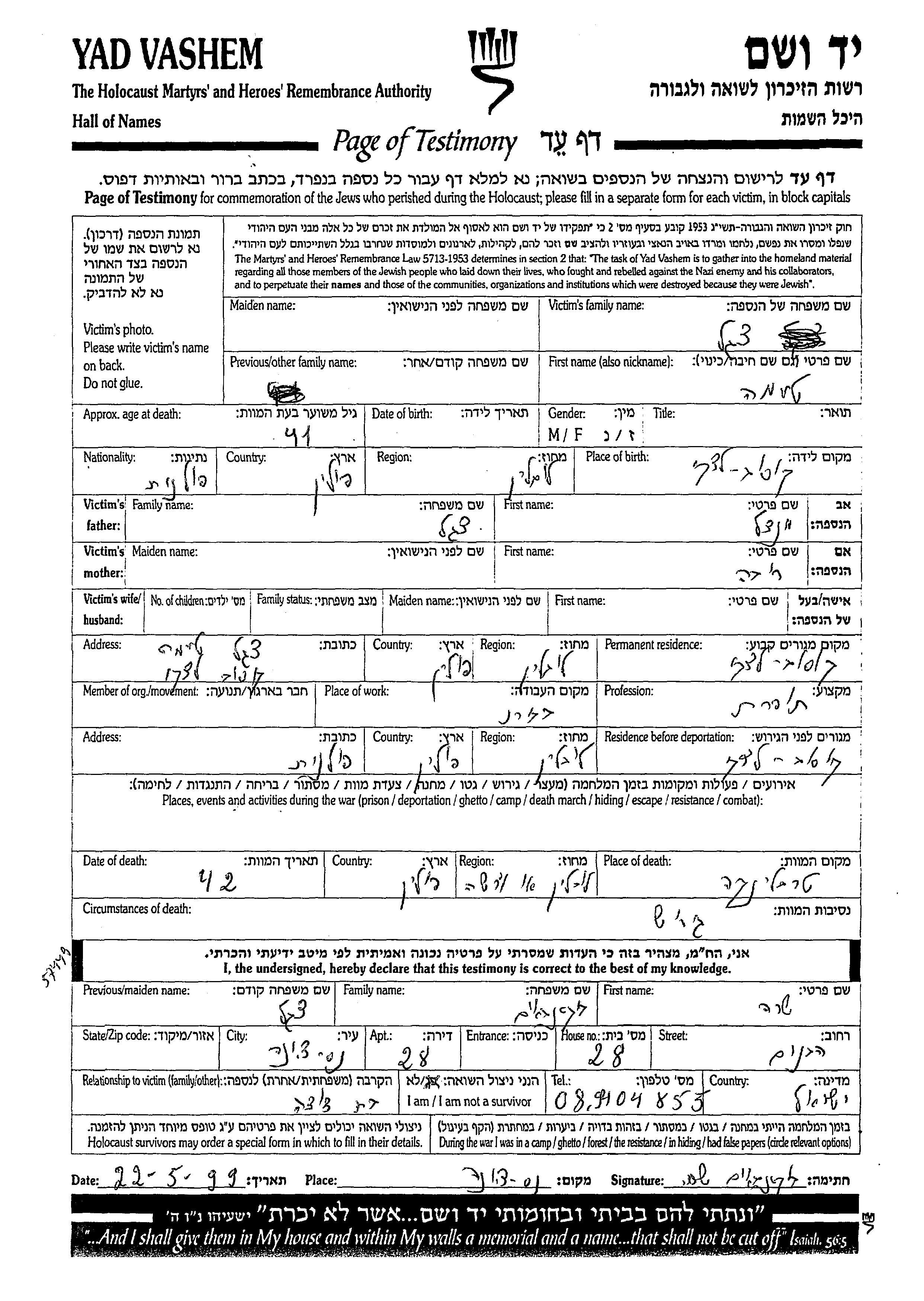 Tema wurde in der Schoah ermordet. Todesort: Treblinka, Polen im Jahr 1942.
