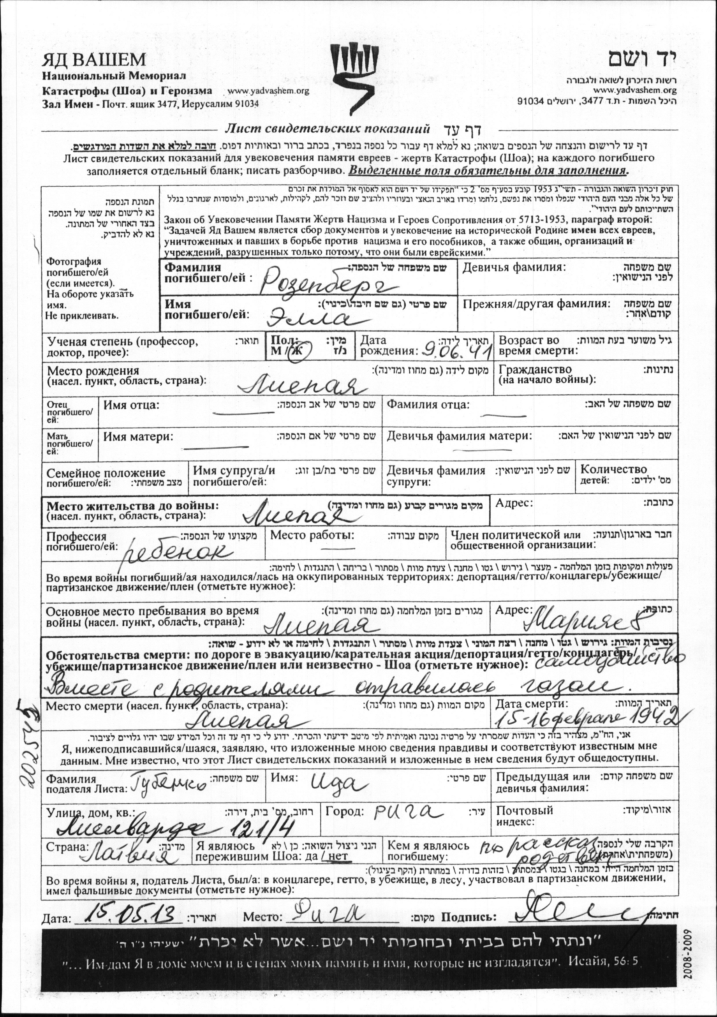 Rozenbergs Ella 1941 Liyepaya, Lettland Verfolgtenliste