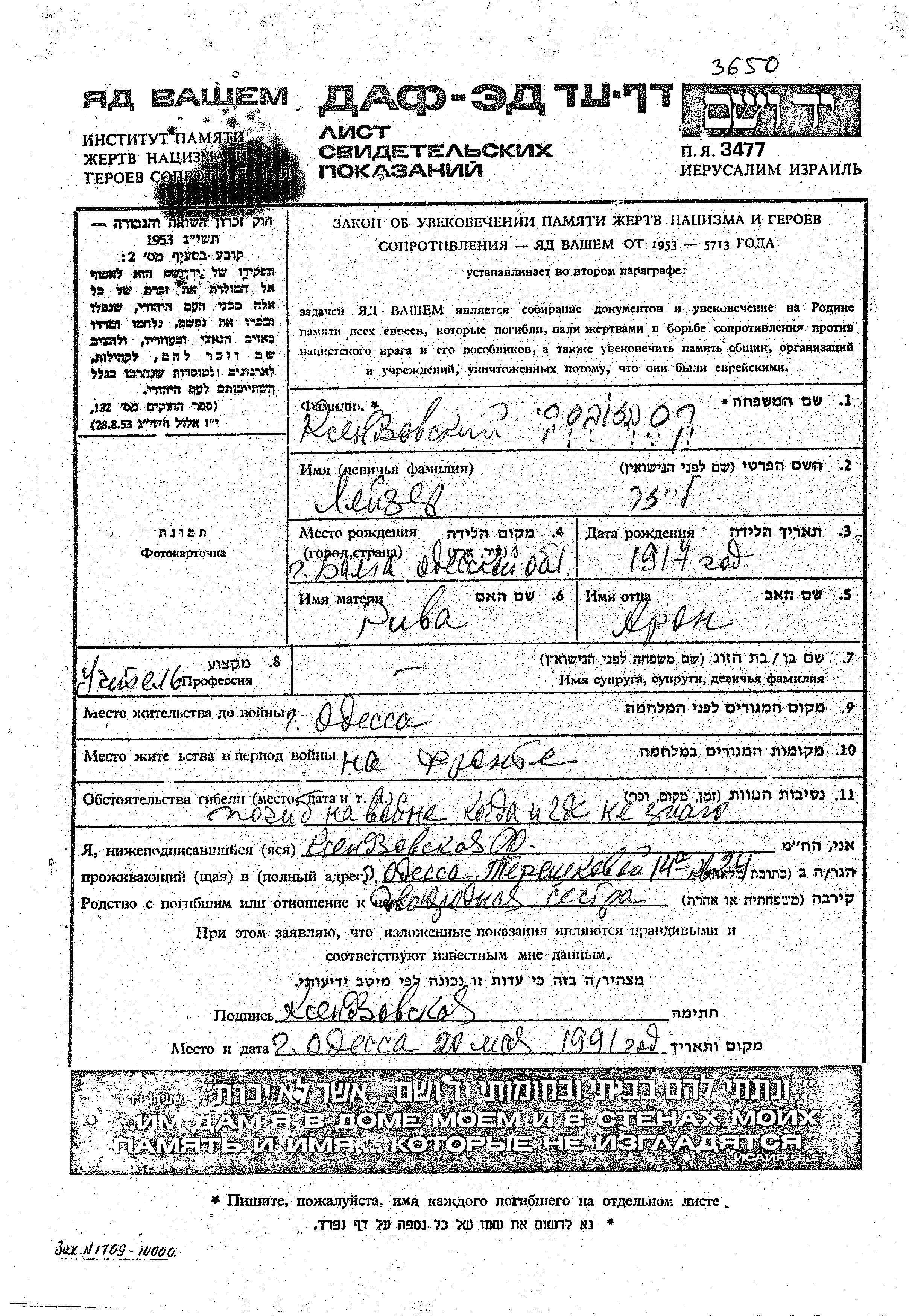 Ksendzovski Leizer 1917 Odessa, Ukraine (UdSSR) Gedenkblatt
